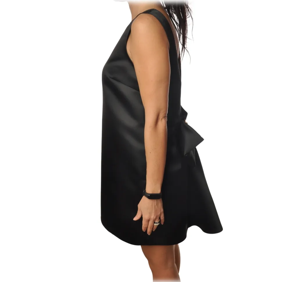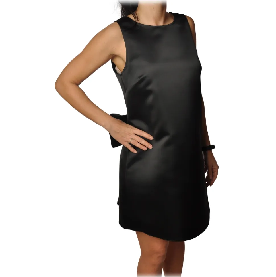Elisabetta Franchi dress, A-line model, boat neckline, sleeveless, with deep V-neckline on the back and large finishing bow.