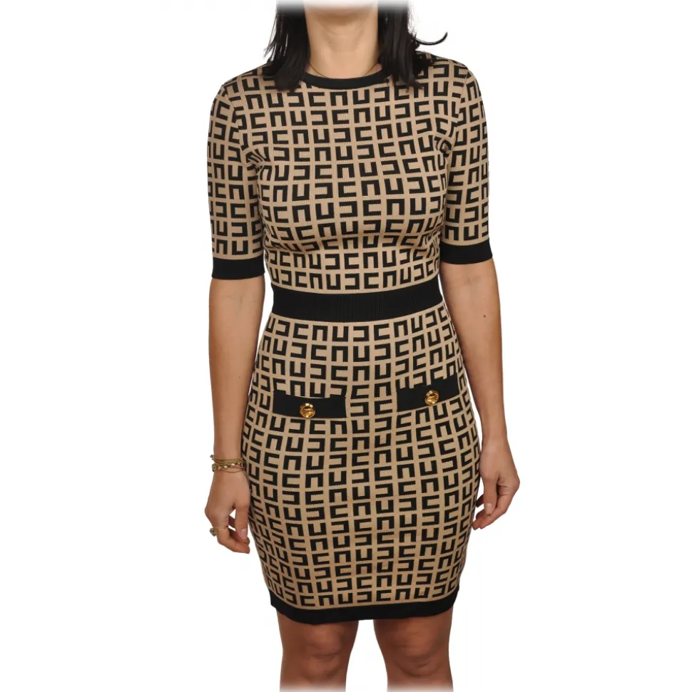 Elisabetta Franchi – Monogram Patterned Sheath Dress – Black/Beige – Dress – Made in Italy – Luxury Exclusive Collection