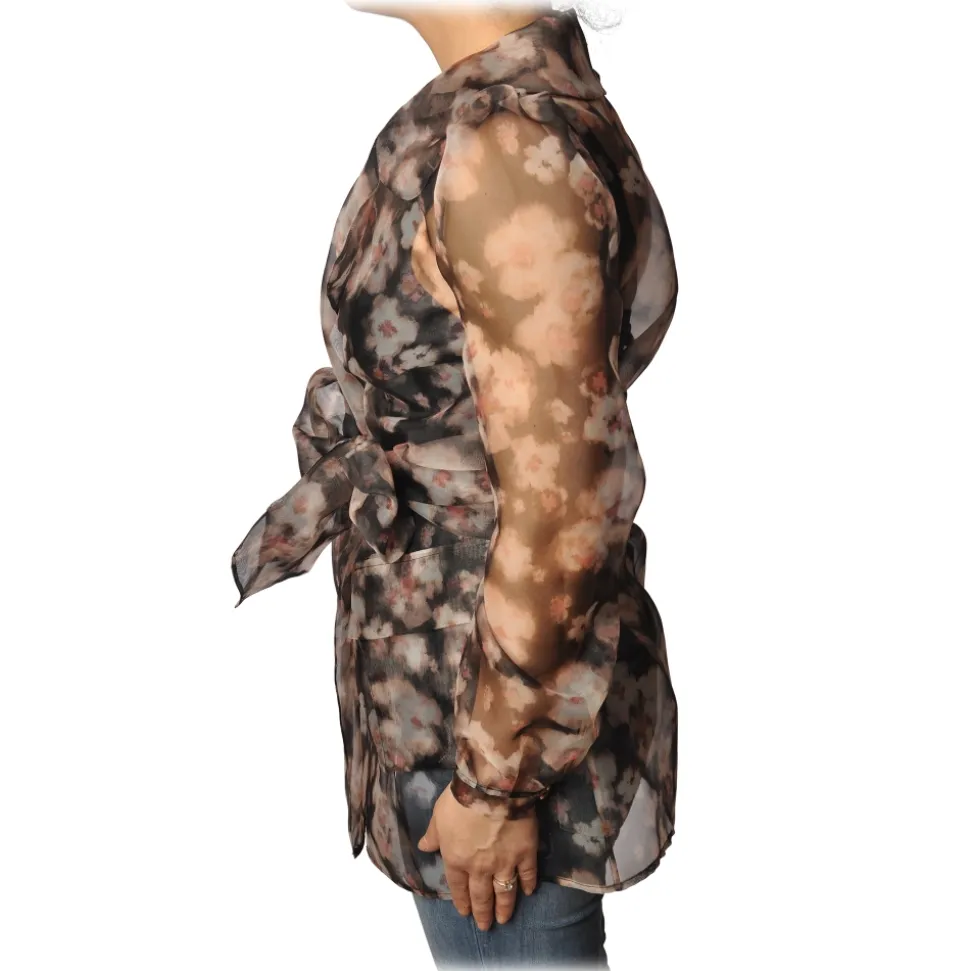 Elisabetta Franchi shirt, open model, long, with closing belt, long sleeves, with two patch pockets, organza effect fabric in floral pattern.