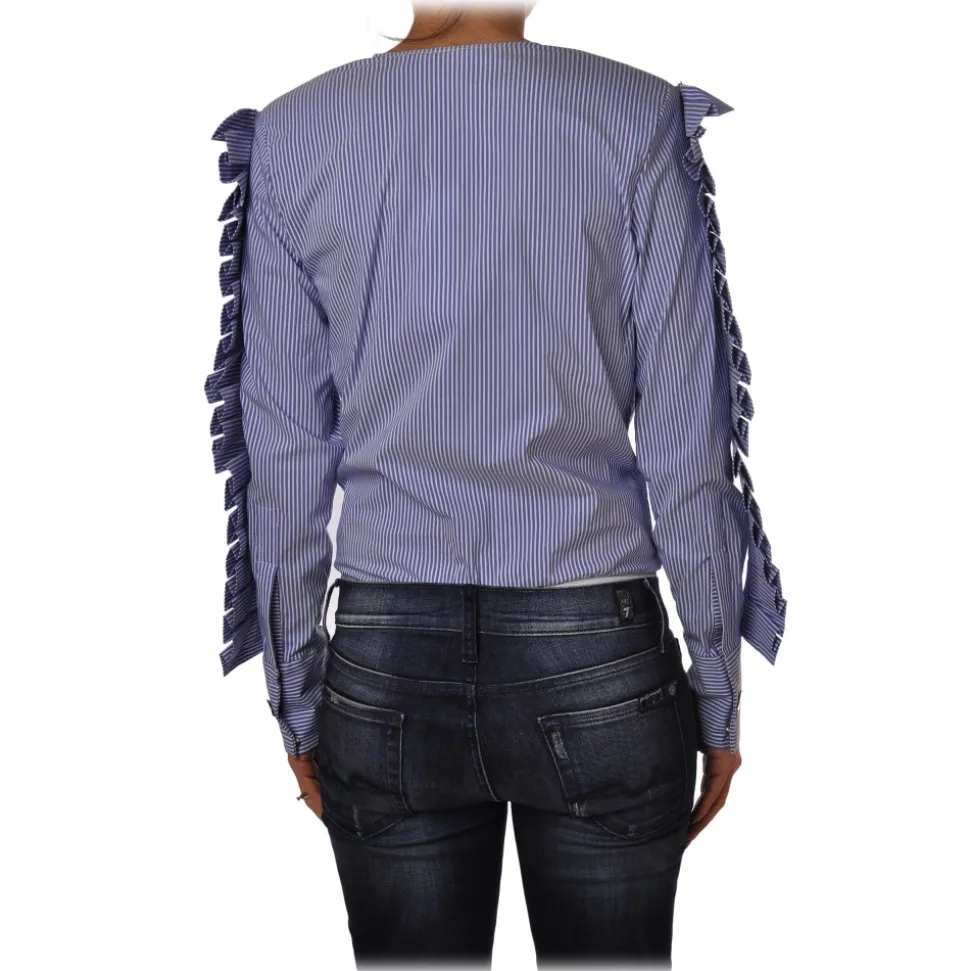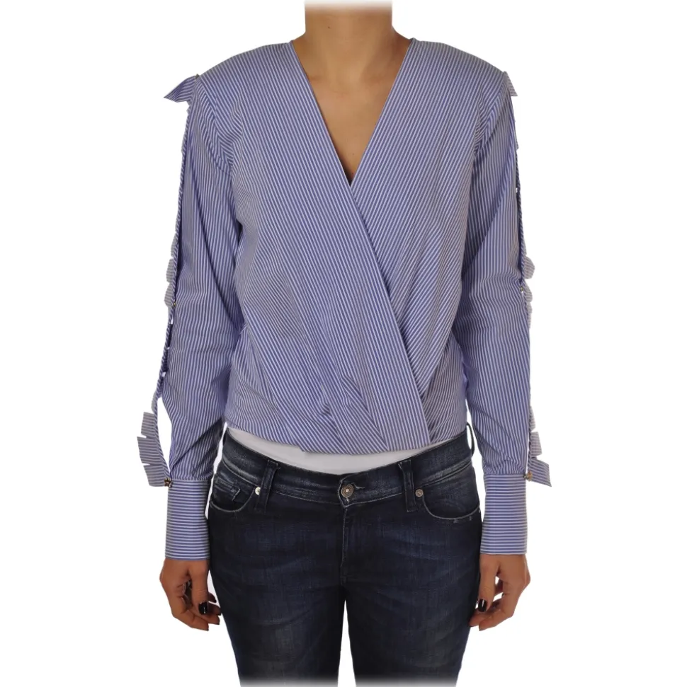 Elisabetta Franchi – Pinstripe Shirt Cross Neckline – White/LightBlue – Top – Made in Italy – Luxury Exclusive Collection