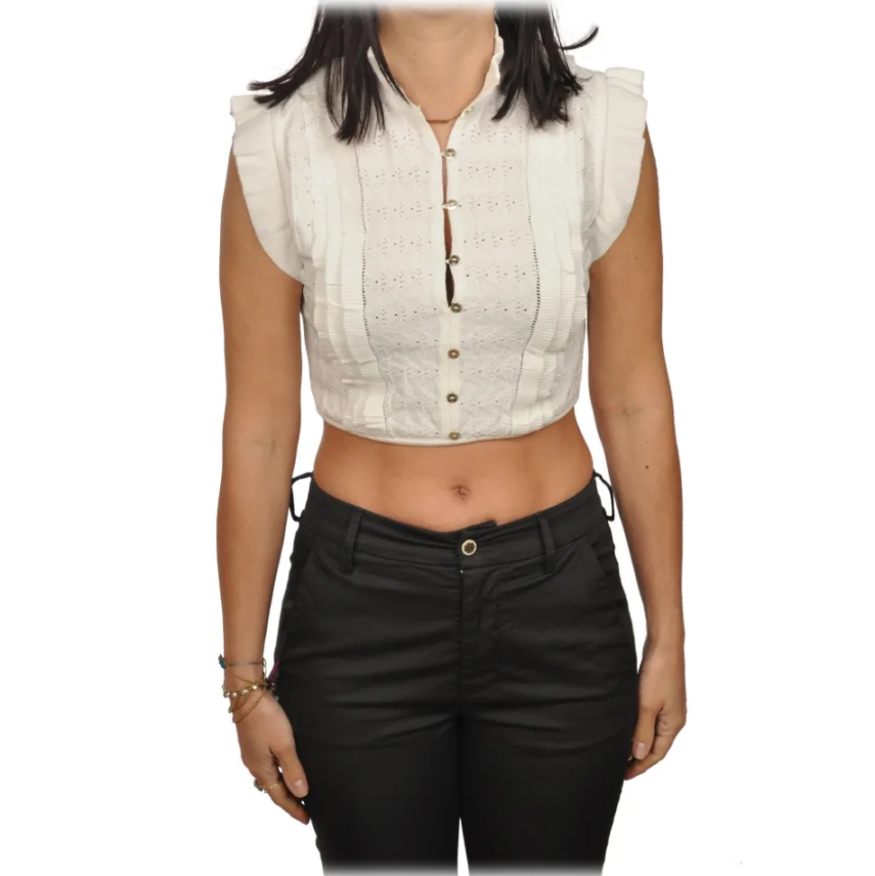 Elisabetta Franchi short sleeveless top with flounce trim, korean collar, with gold metal buttons on the front, in sangallo lace.