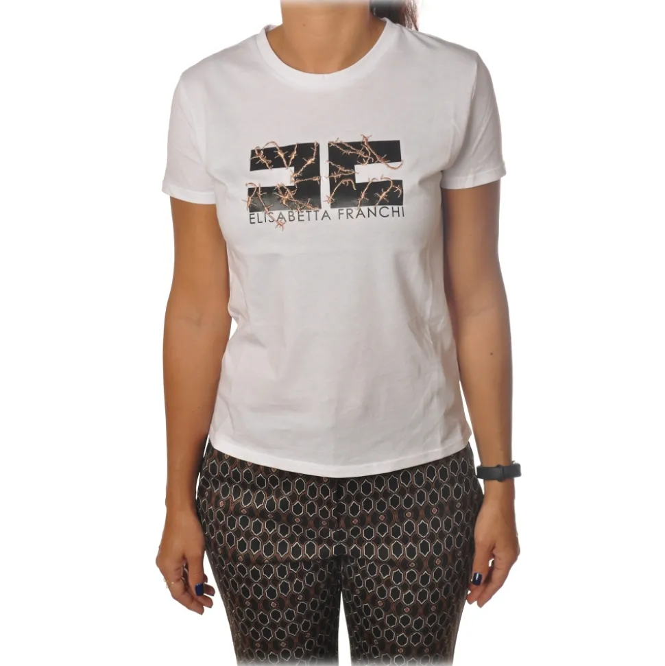 Elisabetta Franchi – Short Sleeve Round Neck T-Shirt – Chalk – T-Shirt – Made in Italy – Luxury Exclusive Collection