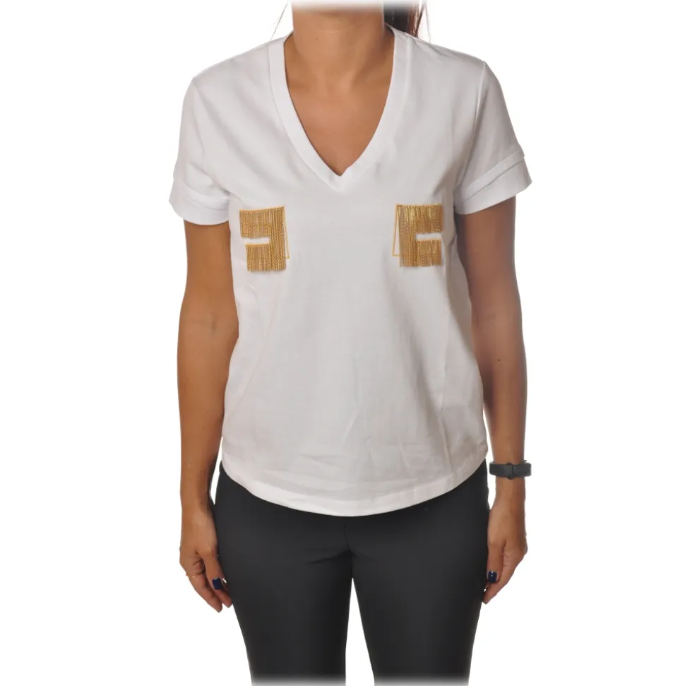 Elisabetta Franchi T-shirt, short sleeve model, in thick cotton, V-neck, with logo on the front finished with small gold chains.