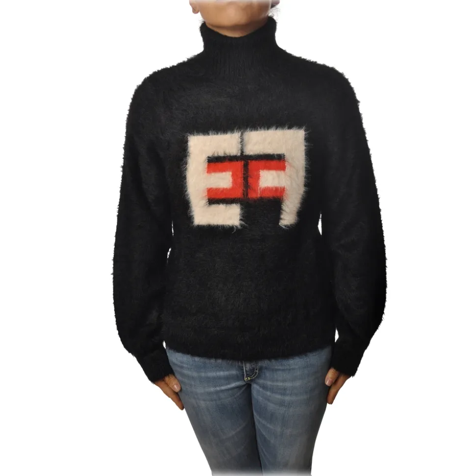 Elisabetta Franchi sweater, short long sleeve model, high collar, in soft stretch yarn, with logo on the front in contrasting color.