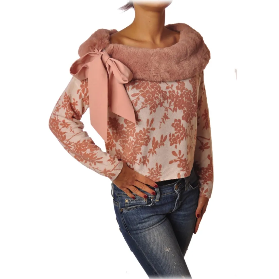 Elisabetta Franchi sweater, model in floral pattern, with boat neck enriched by removable eco-fur in tone of color, with satin bow.