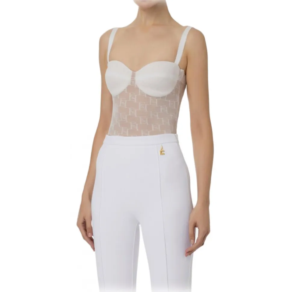 Elisabetta Franchi – Tulle Bodice Top with Logos – White – Top – Made in Italy – Luxury Exclusive Collection