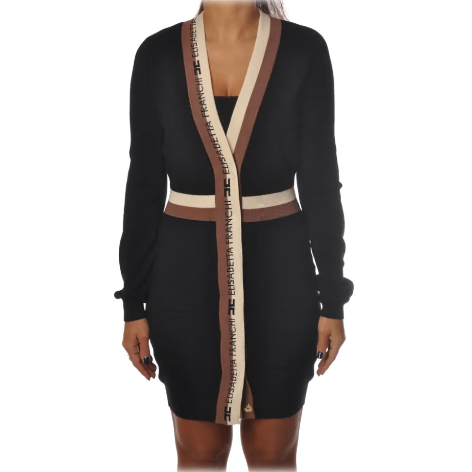 Elisabetta Franchi dress, sheath model with V-neck long sleeve, in stretch knit fabric with two patch pockets on the front, with contrasting color profiles, and logos on the front, with clip buttons on the front covered by fabric.
