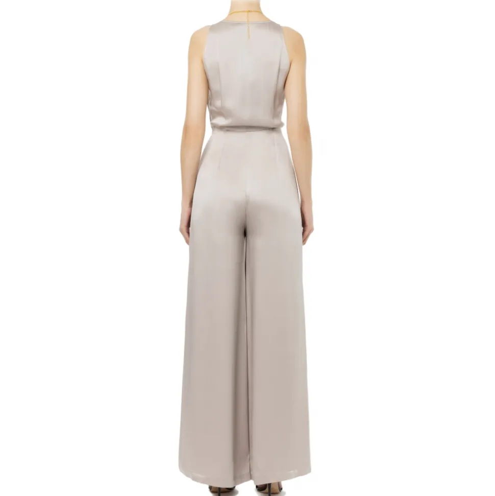 One-piece, sleeveless Elisabetta Franchi jumpsuit with drop neckline and wide-leg trousers in a light, slippery fabric.