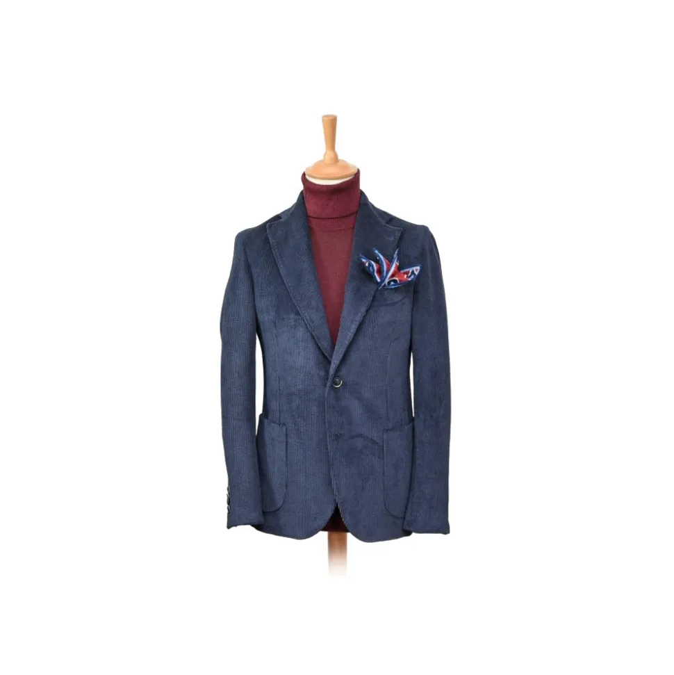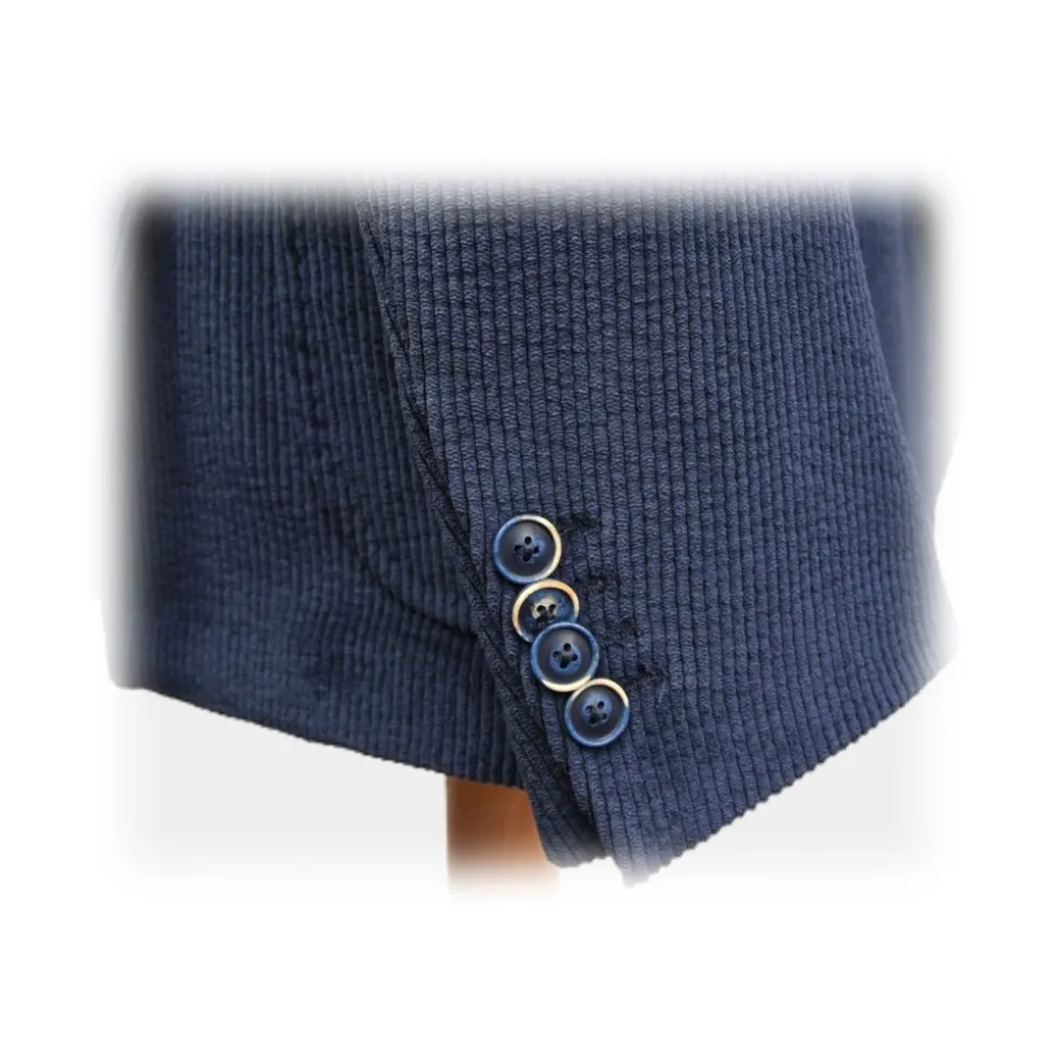 Narrow stripe velvet, striped with 0.3 cm symmetrical rib, unstructured by the warm, resistant, comfortable fabric. Classic lapel, two-button closure in mother of pearl. The cut is Neapolitan tailoring, perfect for the velvet purist in his most used and loved image.