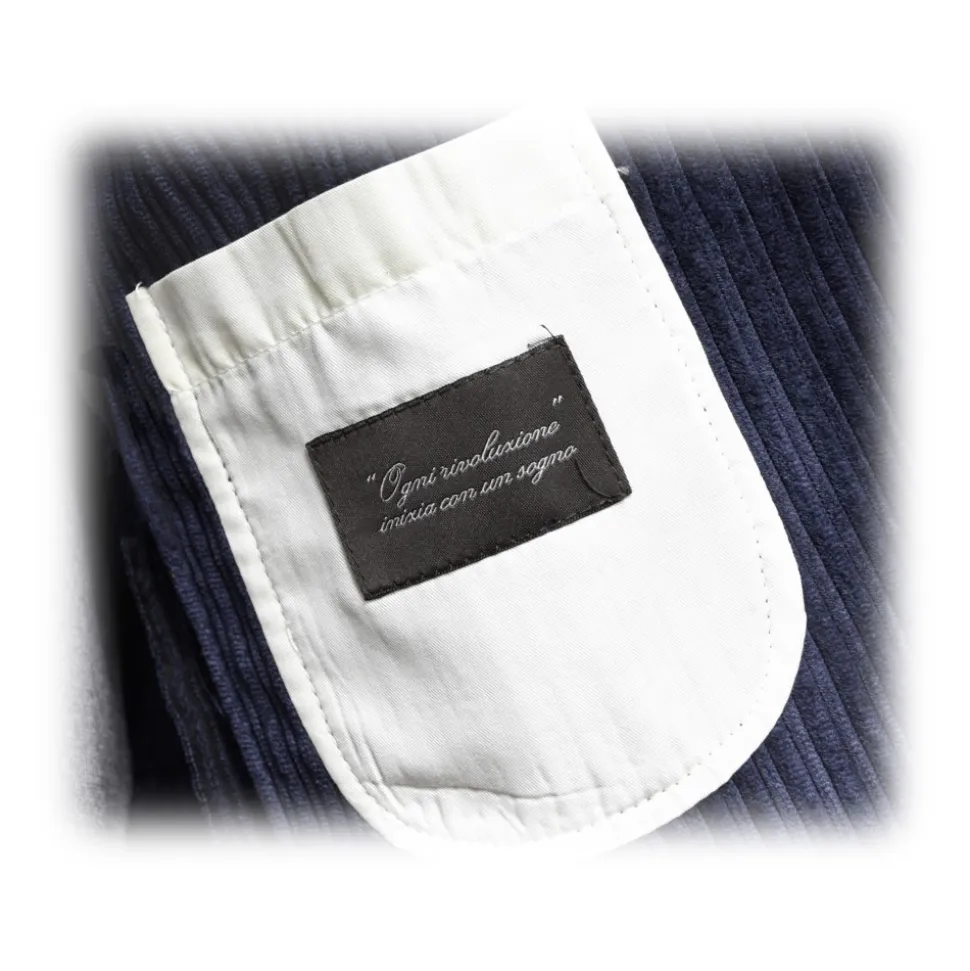 Velvet rib alternating from 0.3 to 0.5 cm. Warm, soft, comfortable, resistant fabric with an incredible ability to hold and refresh the light, creating an authentic play of chiaroscuro. 8cm lapel, two-button closure in mother-of-pearl, deconstructed. The cut is Neapolitan sartorial, perfect for those who love elegance but with a vintage and very refined soul at the same time.
