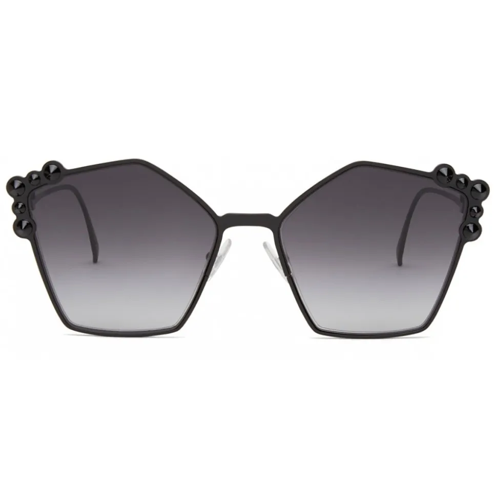 Can Eye sunglasses with an original pentagon shape, reinterpreted for a feminine and modern allure. The black metal frame, very light and comfortable to wear, is embellished with small tone-on-tone studs. The rods with an angled cutting badge are completed by an engraved Fendi logo. Gray gradient lenses.