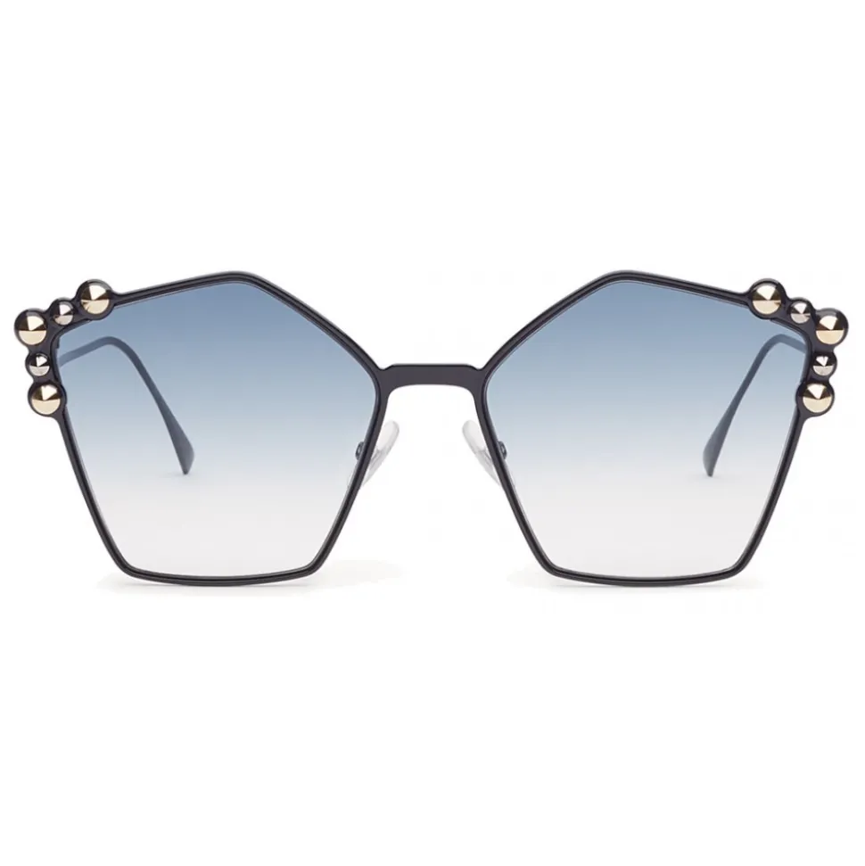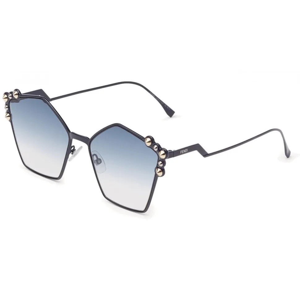 Can Eye sunglasses with an original pentagon shape, re-interpreted for a feminine and modern allure. The blue metal frame, very light and comfortable to wear, is embellished with small gold and ruthenium studs. The rods with an angled cutting badge are completed by an engraved Fendi logo. Blue gradient lenses.