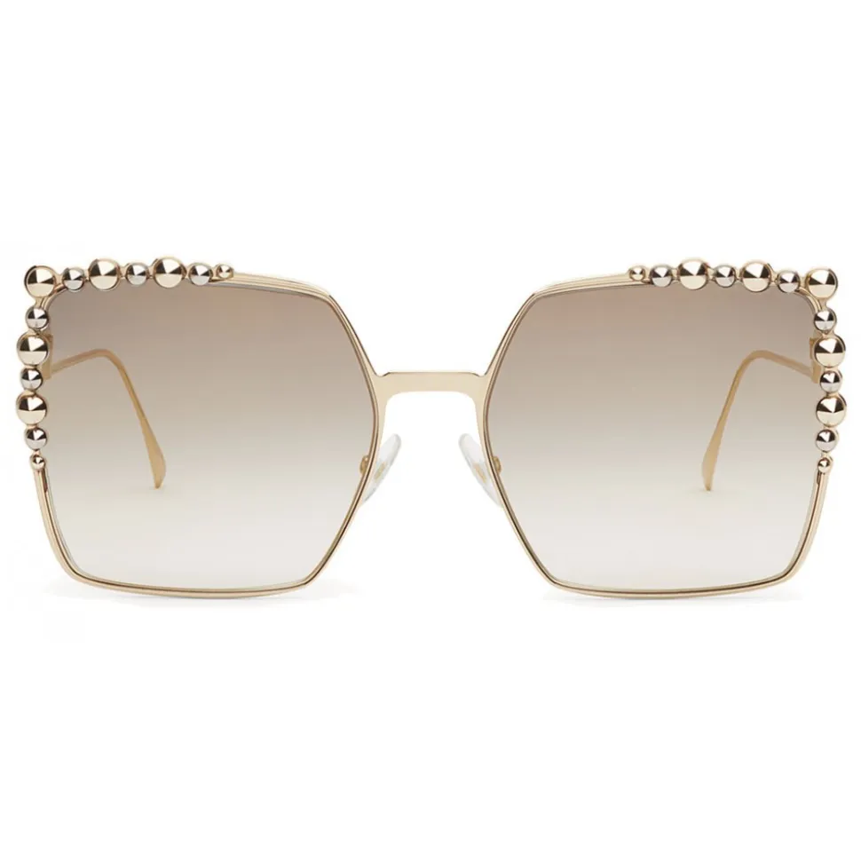 Can Eye sunglasses with a characteristic square and oversize line. The metal frame with golden finish is finished with a double contrasting profile and embellished with small ruthenium studs. Gold-finish temples with angled cut badge, complete with engraved Fendi logo. Gray shaded lenses, mirrored in gold.
