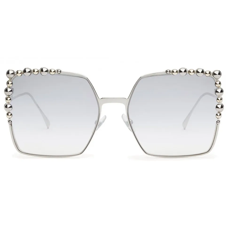 Can Eye sunglasses with a characteristic square and oversize line. The metal frame with silver finish is finished with a double contrasting profile and embellished with small gold and ruthenium studs. Gold-finish temples with angled cut badge, complete with engraved Fendi logo. Gray shaded lenses, mirrored in silver.