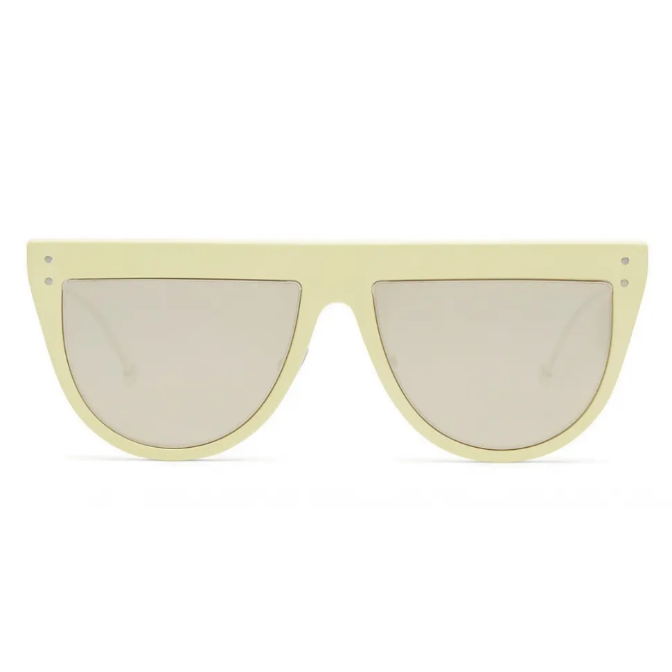 DeFender sunglasses with an oversized aviator shape featuring an innovative flat-top design. The front is made of yellow optyl and the thin metal temples with gold finish, complemented by the Fendi lettering and round terminals in the shape of the F is Fendi logo. Adjustable nose pads. Flat lenses with gold mirror effect. Made in Italy.
