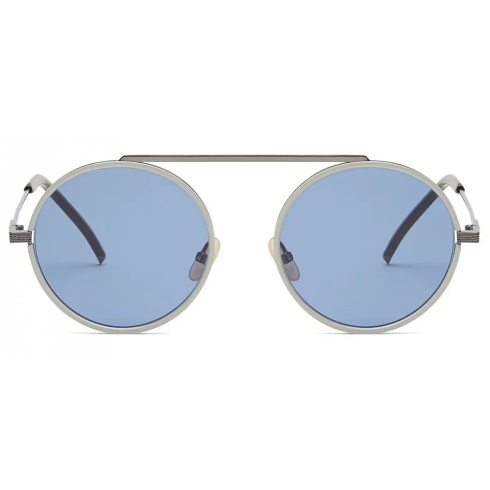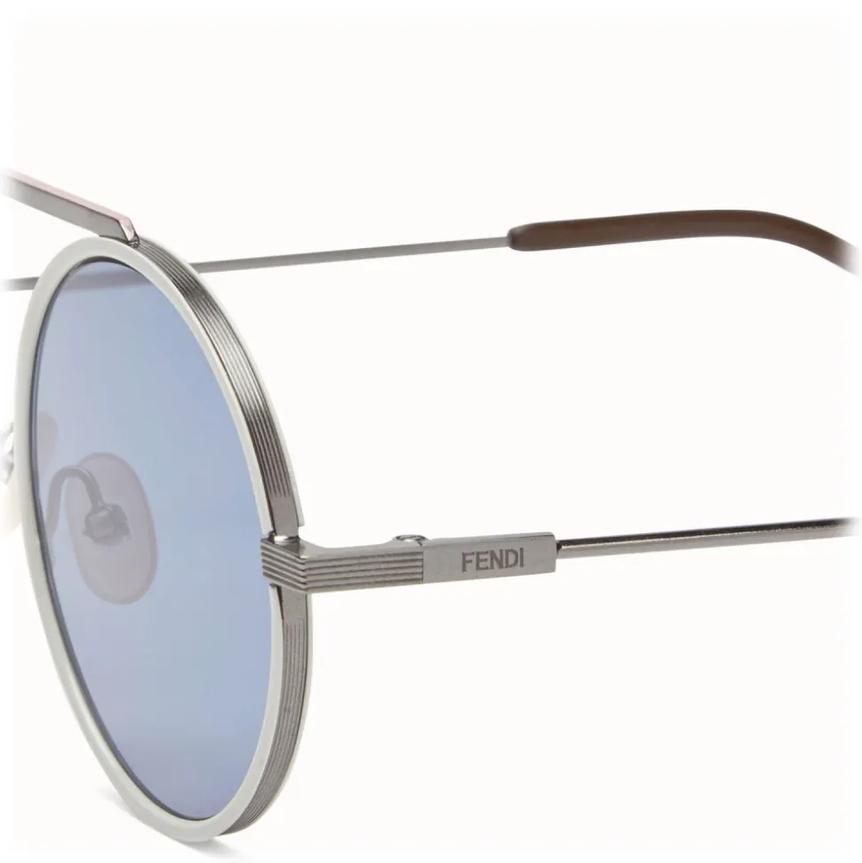 Everyday Fendi sunglasses with a round shape, characterized by a distinctive design that expresses a business-casual mood. The frame is made of metal with dark ruthenium finish, with a white acetate layer that creates a modern bi-layer effect. The high bridge is finished with contrasting painted edges. The triangular shape of the temples is an exclusive feature of Fendi eyewear, highlighted by the black terminals. Fendi logo engraved. Gray-blue lenses.
