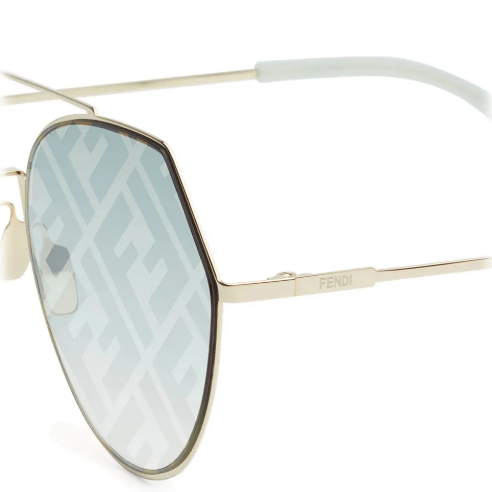 Aviator-shaped sunglasses in gold-colored metal, complemented by thin temples and opal-green terminals. Faded green lenses with gold mirrored print of the FF logo. Adjustable nose pads. Made in Italy.