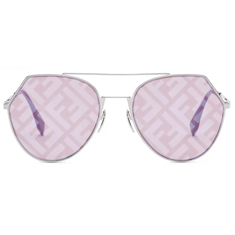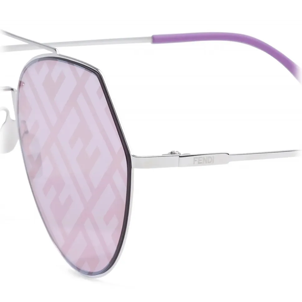 Ultra-flat and ultra-lightweight rounded aviator sunglasses in palladium color metal. Double bridge and thin temples with purple tips branded with a metal triangle. Purple lenses with all-over silver mirror-effect FF logo. Adjustable nose pads. Made in Italy.