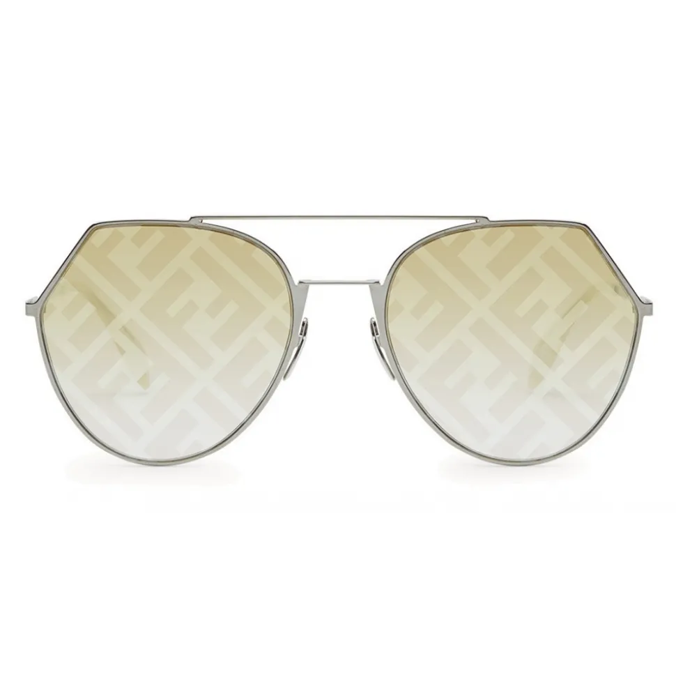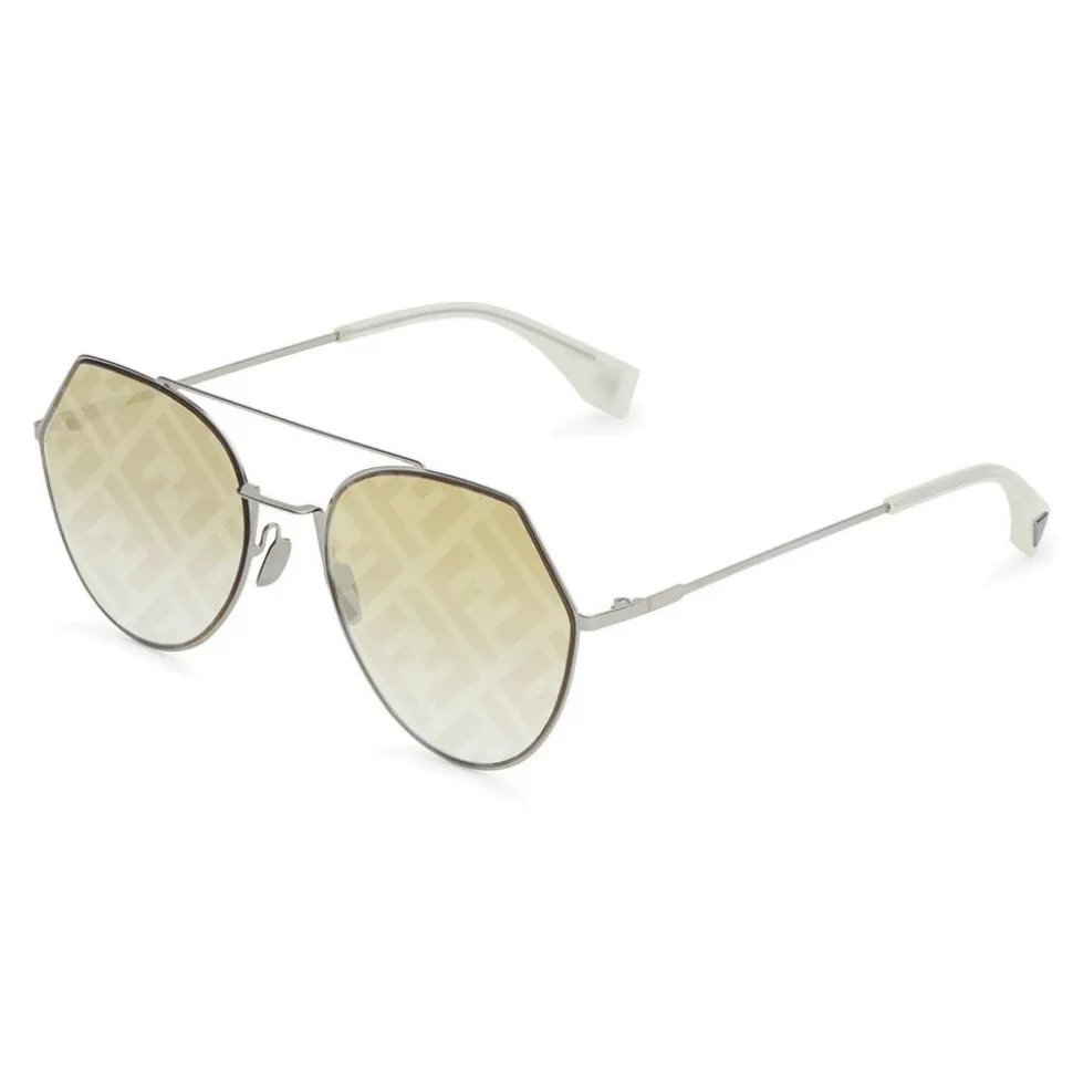 Aviator-shaped sunglasses in ruthenium-colored metal, complemented by slender temples and opal yellow terminals. Brown lenses with silver mirrored print of the FF logo. Adjustable nose pads. Made in Italy.