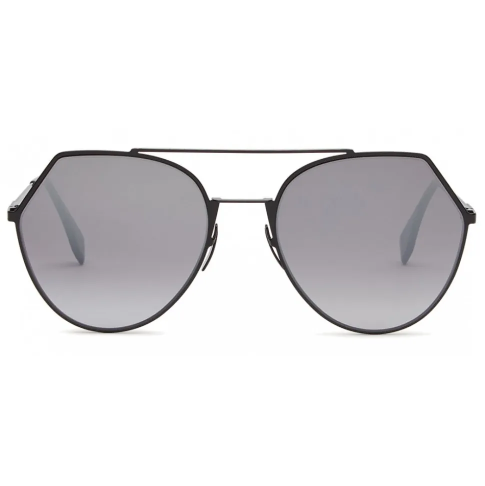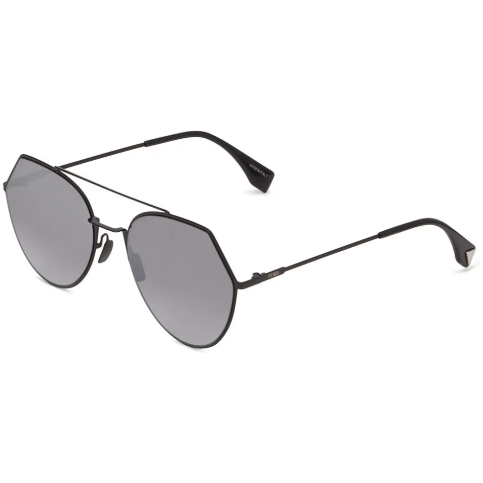 Sunglasses with a rounded line, interpreted in a geometric and modern key. The frame is in metal with a black finish, completed by thin temples and terminals of the same color. Fendi logo laser engraved. Slightly mirrored black lenses.