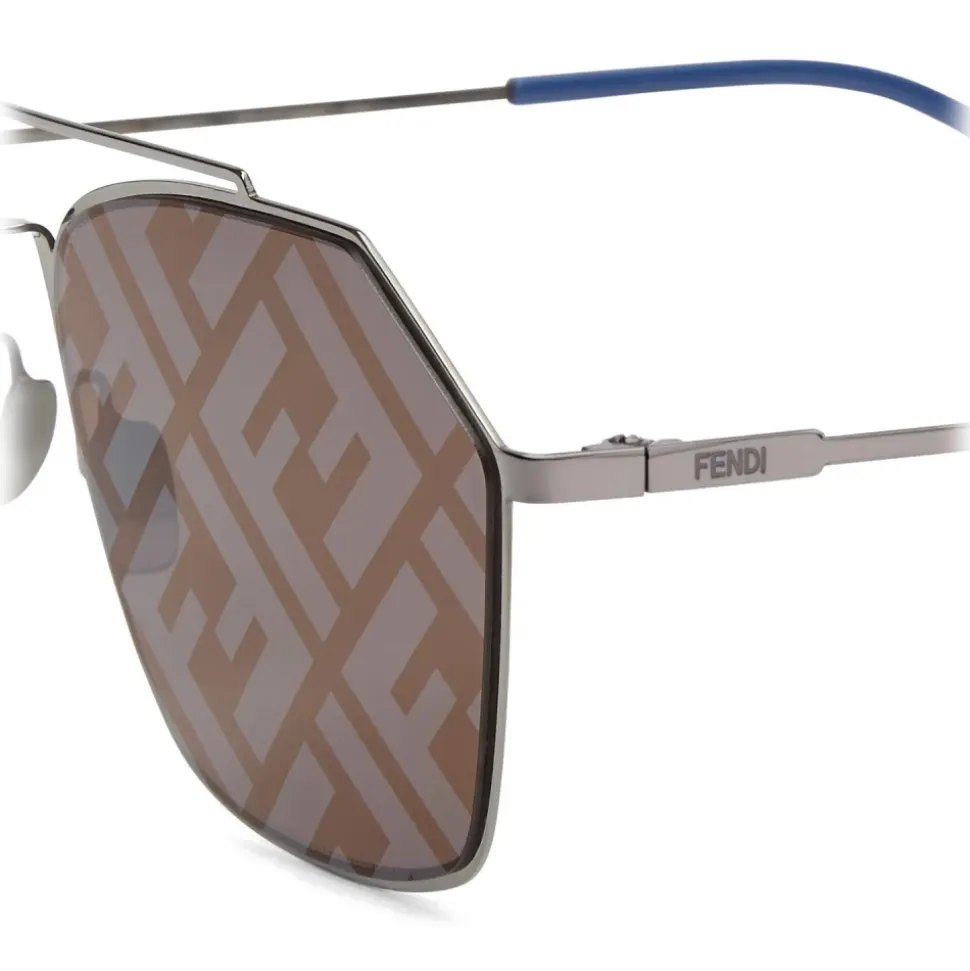 Rectangular model in ruthenium-colored metal with a flat and ultra-light design. Double bridge and thin temples with blue tips branded with a metal triangle. Brown lenses with all-over gold mirror-effect FF logo. Adjustable nose pads. Made in Italy.