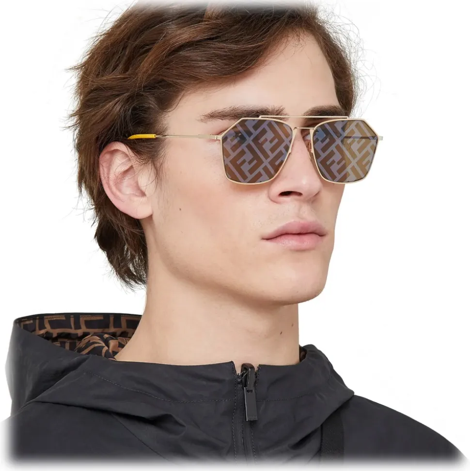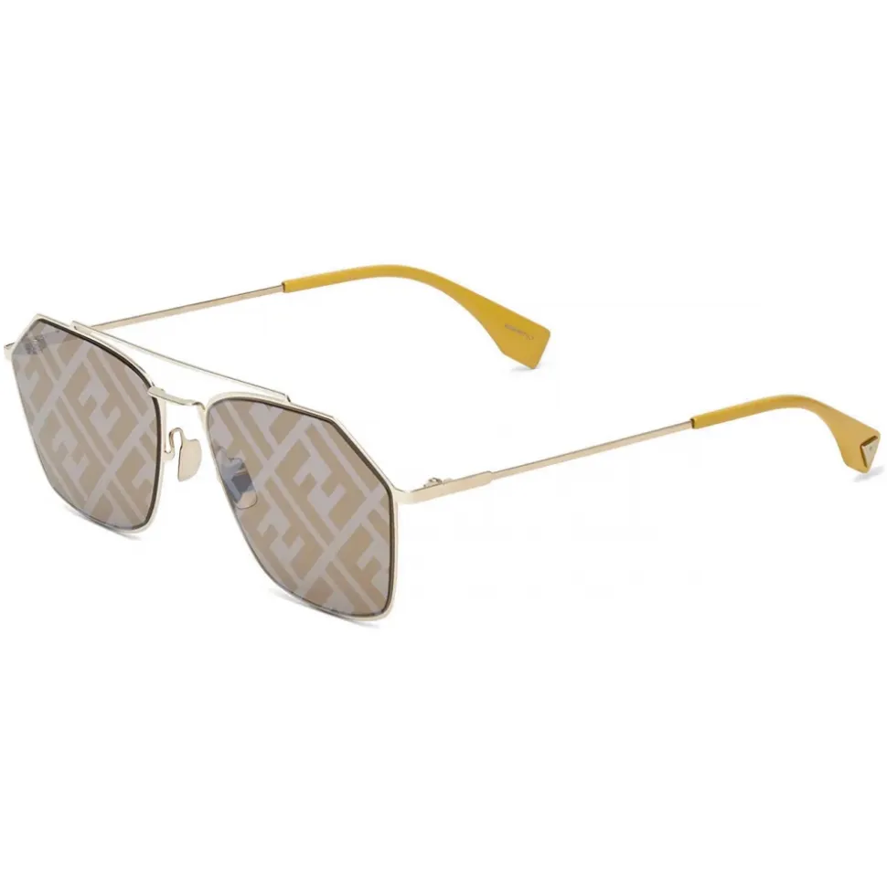 Rectangular model in gold-colored metal with a flat and ultra-light design. Double bridge and thin temples with yellow tips branded with a metal triangle. Gray lenses with all-over gold mirror-effect FF logo. Adjustable nose pads. Made in Italy.