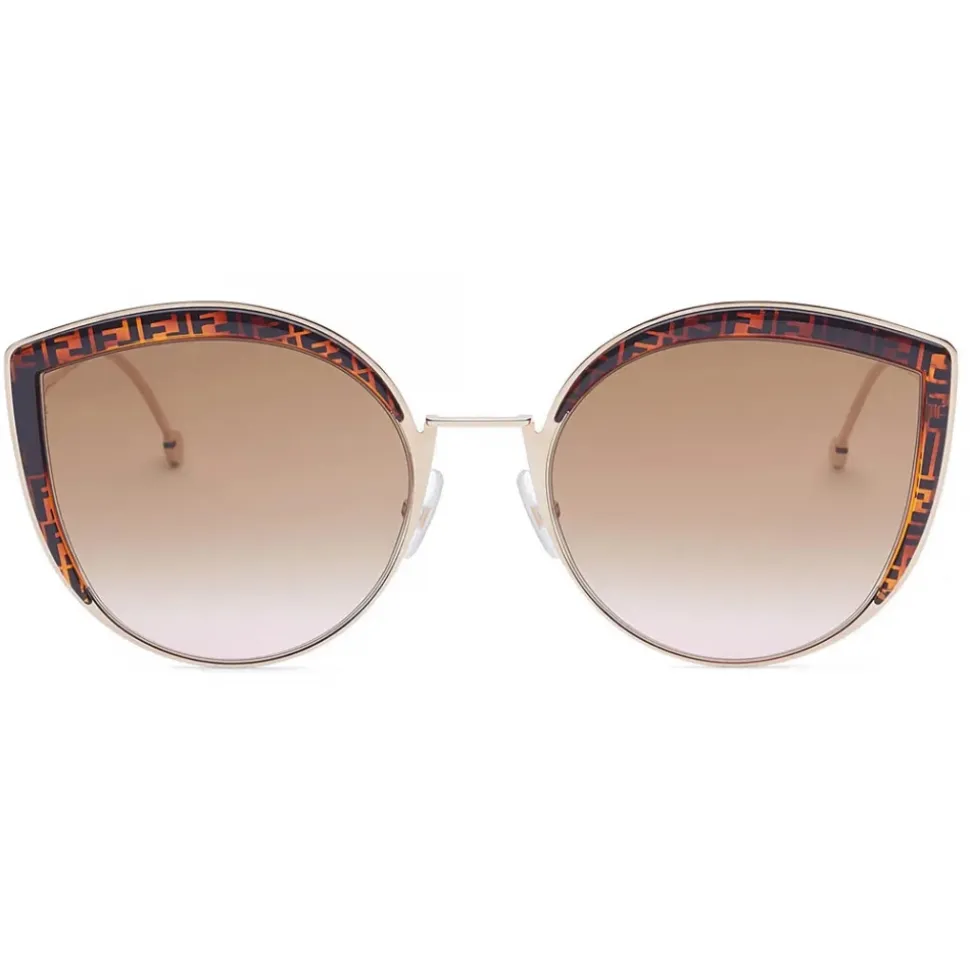 Cat-eye shape oversize sunglasses in rose-gold-color metal. Front with inserts in Fendi exclusive Havana-color acetate with FF logo. Temple with F is Fendi logo and rounded tips. Brown to pink gradient lenses. Adjustable nose pads. Made in Italy.