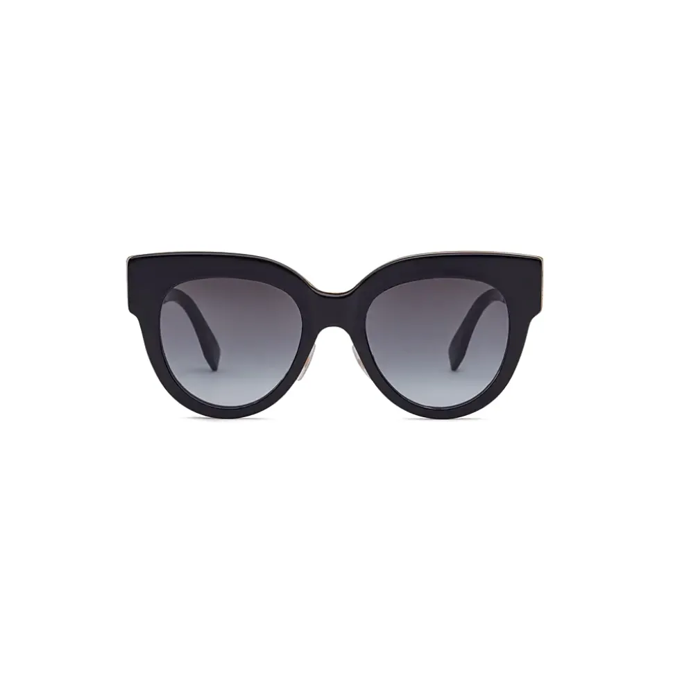 F is Fendi sunglasses with a sophisticated and feminine character, made of black acetate. The cat-eye frame front is enhanced by a gold-finish metal thread. The temples have a cut-out F is Fendi metallic logo. Gray gradient lenses. Made in Italy.