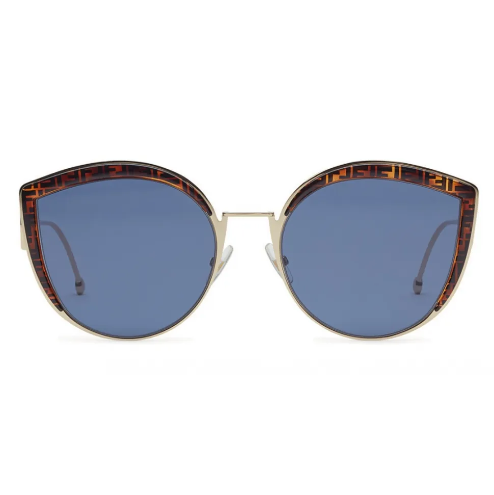 F is Fendi sunglasses with an oversized cat-eye shape, made of gold-plated metal. The model has a sophisticated and feminine design, the blue lenses are enriched by FF havana acetate edges. Thin temples decorated with the F is Fendi logo, laser engraved on the round terminals. Adjustable nose pads. Made in Italy.