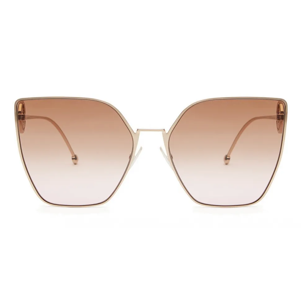 F is Fendi sunglasses with wide, light and feminine lines. The model has an oversized cat-eye shape and is made of gold-colored metal. The thin temples are decorated with the F is Fendi logo, also shown on the terminals. Brown and pink gradient lenses. Made in Italy.