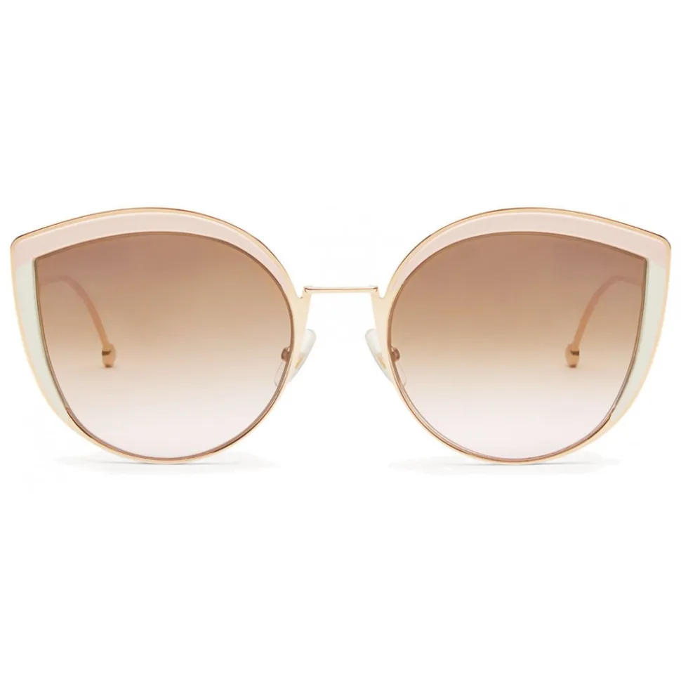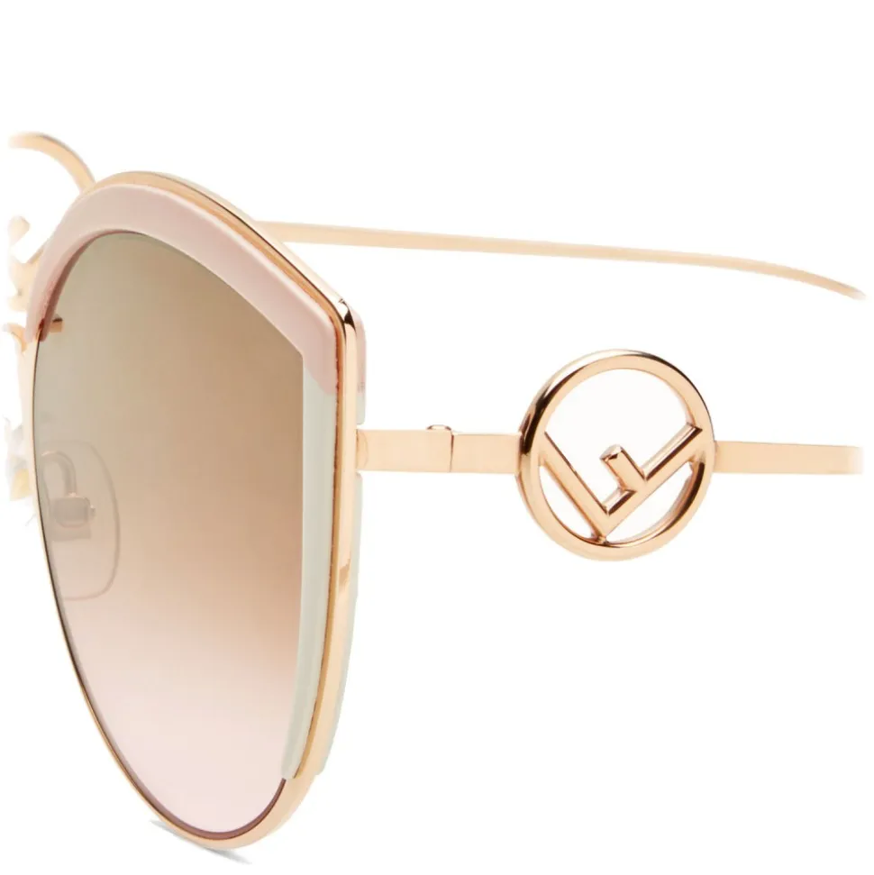 F is Fendi sunglasses with an oversized cat-eye shape, made of palladium-colored metal. The model has a sophisticated and feminine design, emphasized by the edges in pink and white dégradé acetate. The thin temples are decorated with the new Fendi logo, also shown on the terminals. Brown and pink gradient lenses with mirrored effect.