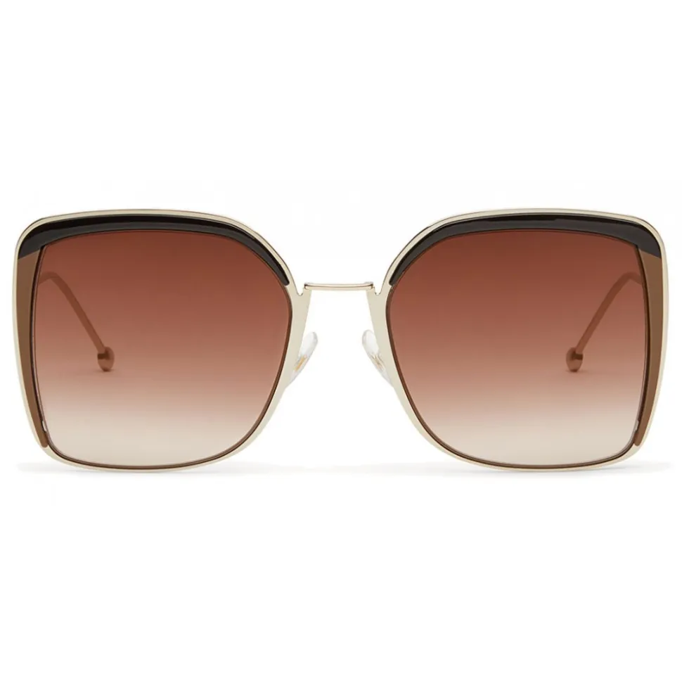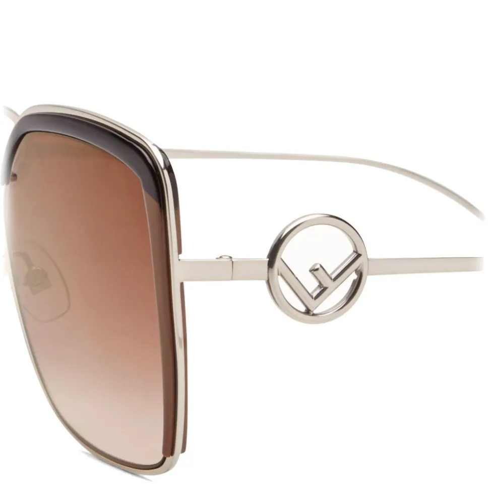 F is Fendi sunglasses with an oversized squared shape, made of gold-colored metal. The model has a sophisticated and feminine design, emphasized by the edges in black and brown acetate. The thin temples are decorated with the new Fendi logo, also shown on the terminals. Brown gradient lenses with gold mirrored effect.