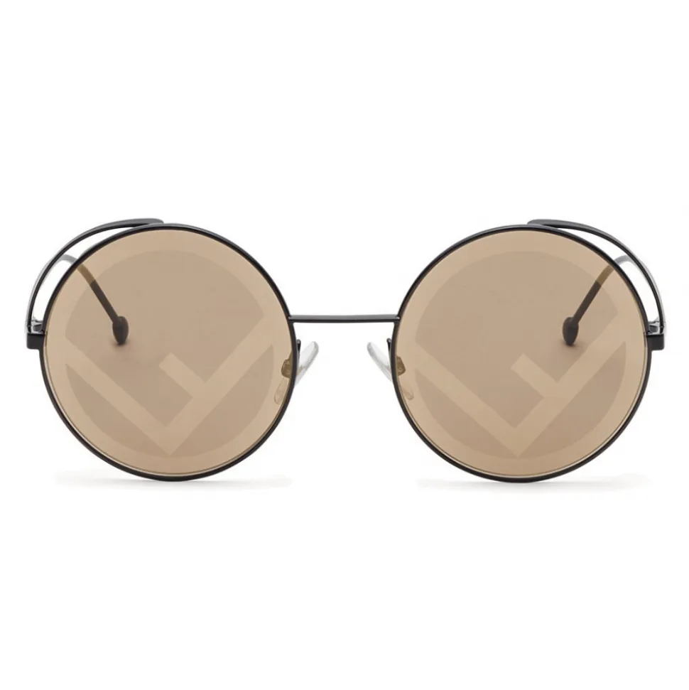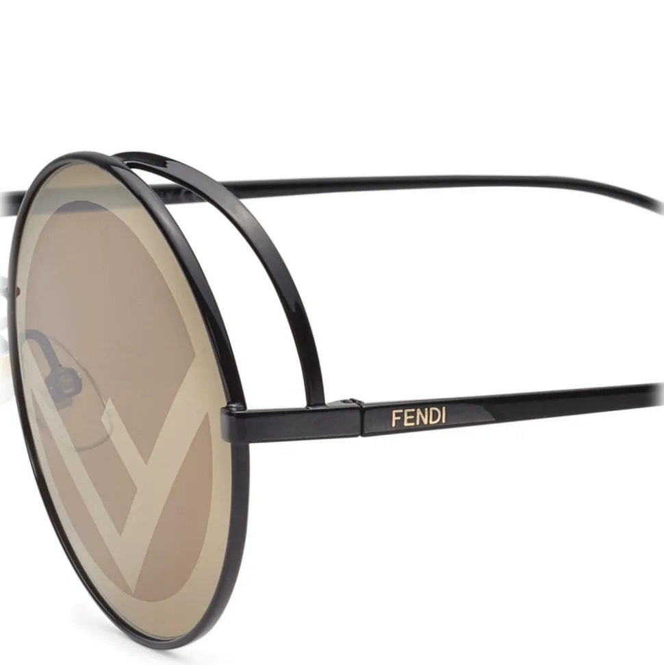 Fendirama sunglasses with a round shape. The lightweight frame in black painted metal has thin spoilers and temples with round ends. The brown lenses are decorated with a cliché print that reproduces the F is Fendi logo with a gold mirror effect. Made in Italy.