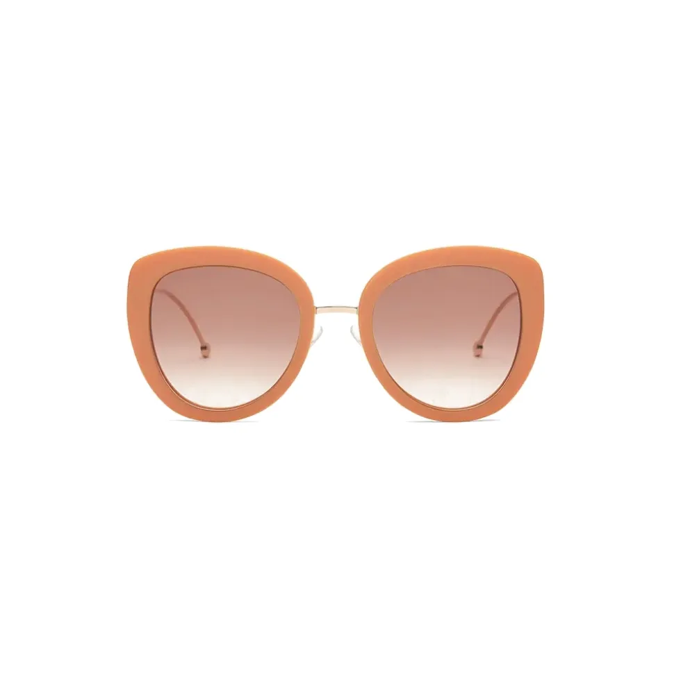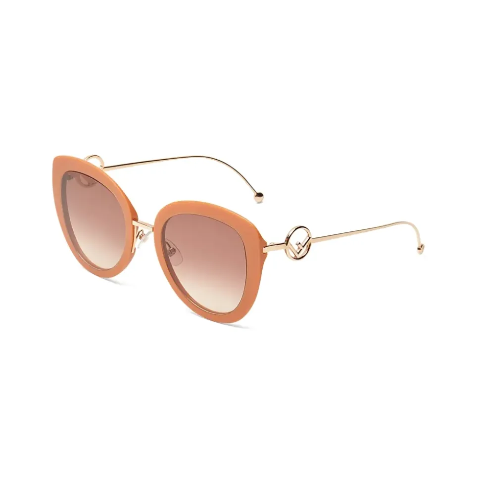 Round model made of orange acetate with gold-colored metal bridge and temples. Embellished on the temples with F IS FENDI logo and featuring brown gradient lenses. Adjustable nose pads. Made in Italy.