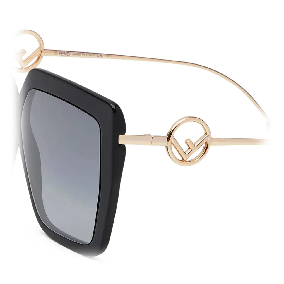 Square, oversize model made of black acetate with gold-colored metal temples. Temples decorated with F IS FENDI logo and round metal tips. Gray gradient lenses. Adjustable nose pads. Made in Italy.