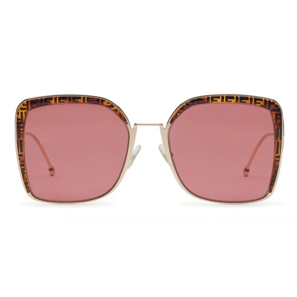F is Fendi sunglasses with oversized square shape, made of metal with COPPER finish. The model has a sophisticated and feminine design, the cherry red lenses are enriched by FF havana acetate edges. Thin temples decorated with the F is Fendi logo, laser engraved on the round terminals. Adjustable nose pads. Made in Italy.