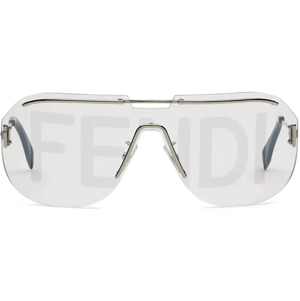 These shield glasses, presented in the 2020 Autumn/Winter fashion show, feature a characteristic, ultra-lightweight design. Bridge and slender branded temples in palladium-color metal with matte yellow tips. Gray mirror-effect silver lenses with Fendi logo. Adjustable nose pads. Made in Italy.