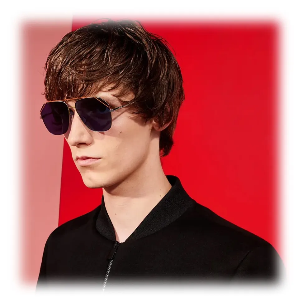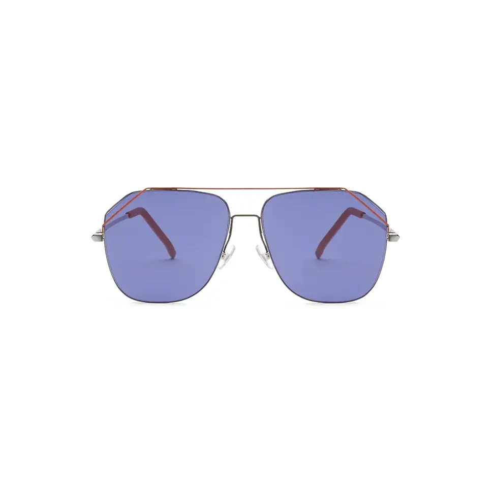 FendiFiend caravan sunglasses, made of metal with a light gold finish. The style is distinguished by a “UFO” construction, an orange metal wire that frames the lenses, creating an unique geometric effect. Triangular temples customized with engraved Fendi logo and orange tips. Slender bridge and adjustable nosepads. Blue lenses. Made in Italy.
