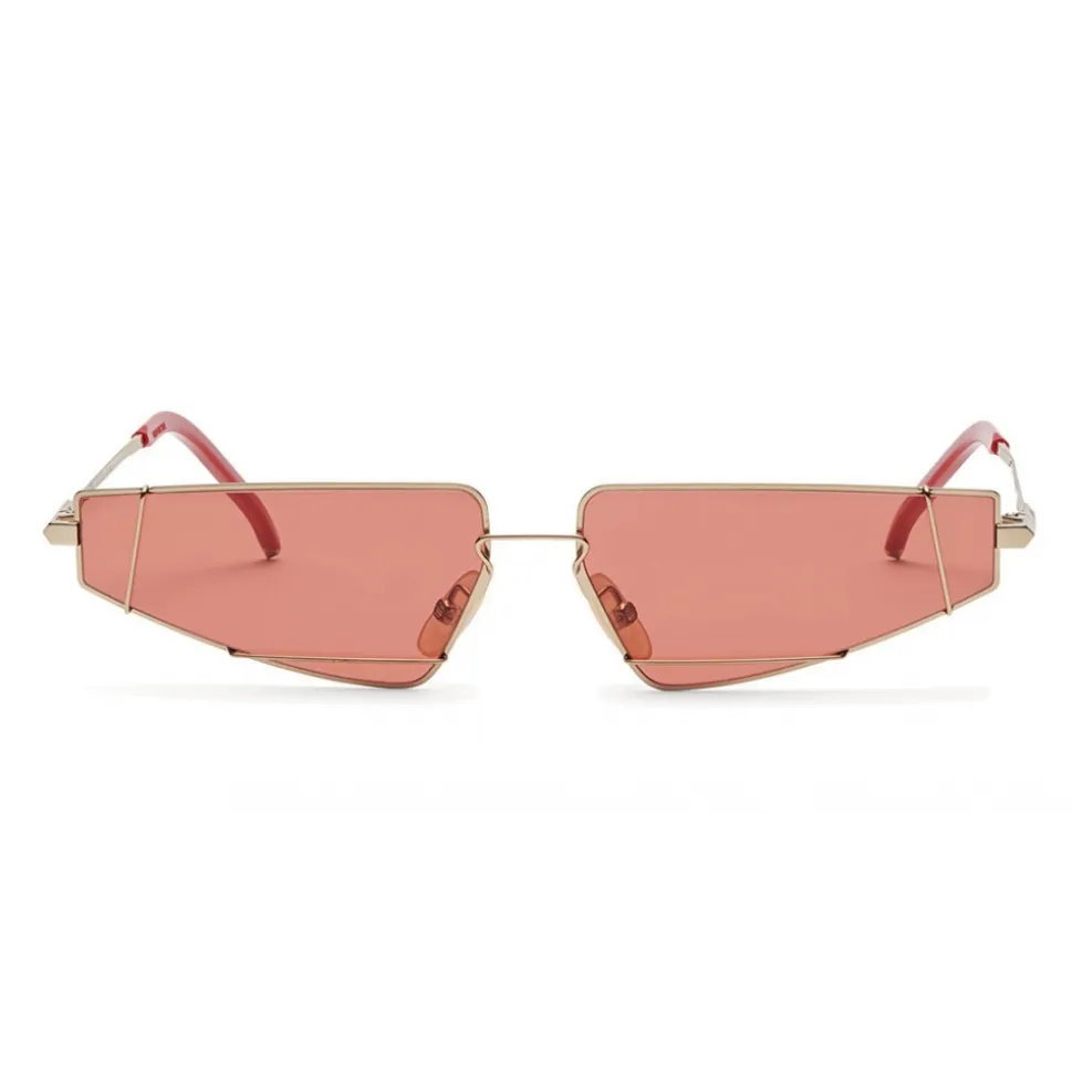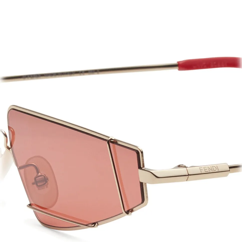 FendiFiend sunglasses characterized by a contemporary cat-eye shape. The model is made of metal with a gold finish and presents the new “UFO” construction, a red metal wire that frames the lenses creating a retro-futuristic geometric effect. Triangular custom temples with engraved Fendi logo and red terminals. Adjustable nose pads. Red lenses. Made in Italy.