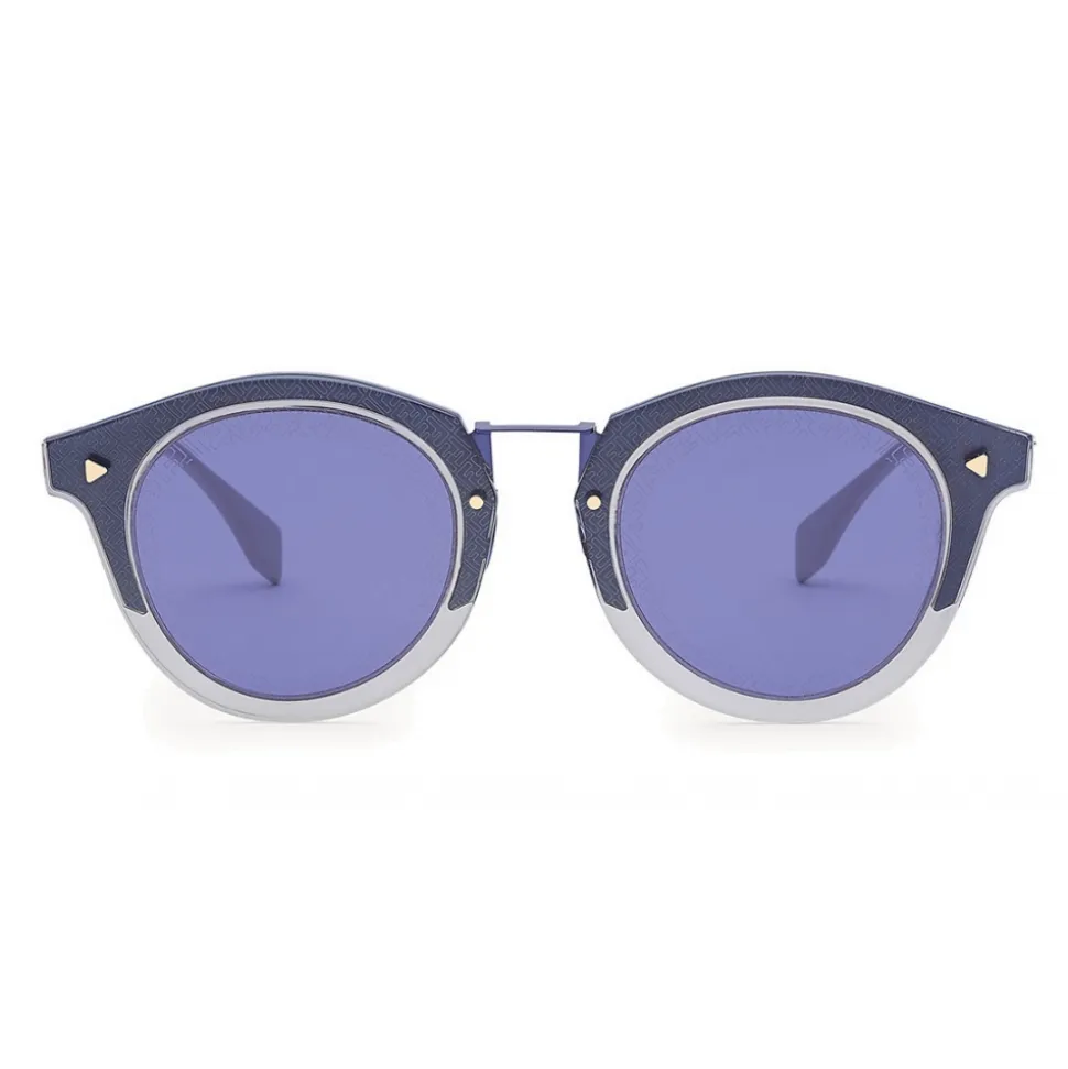 Round-shaped FF sunglasses with transparent and blue optyl front and gold-plated metal temples. The sophisticated and light lines of the model are personalized with the iconic FF motif, engraved on the edge of the lenses and on the metal half circle. Complete with triangular rivets, adjustable nose pads and contrasting terminals. Blue lenses. Made in Italy.