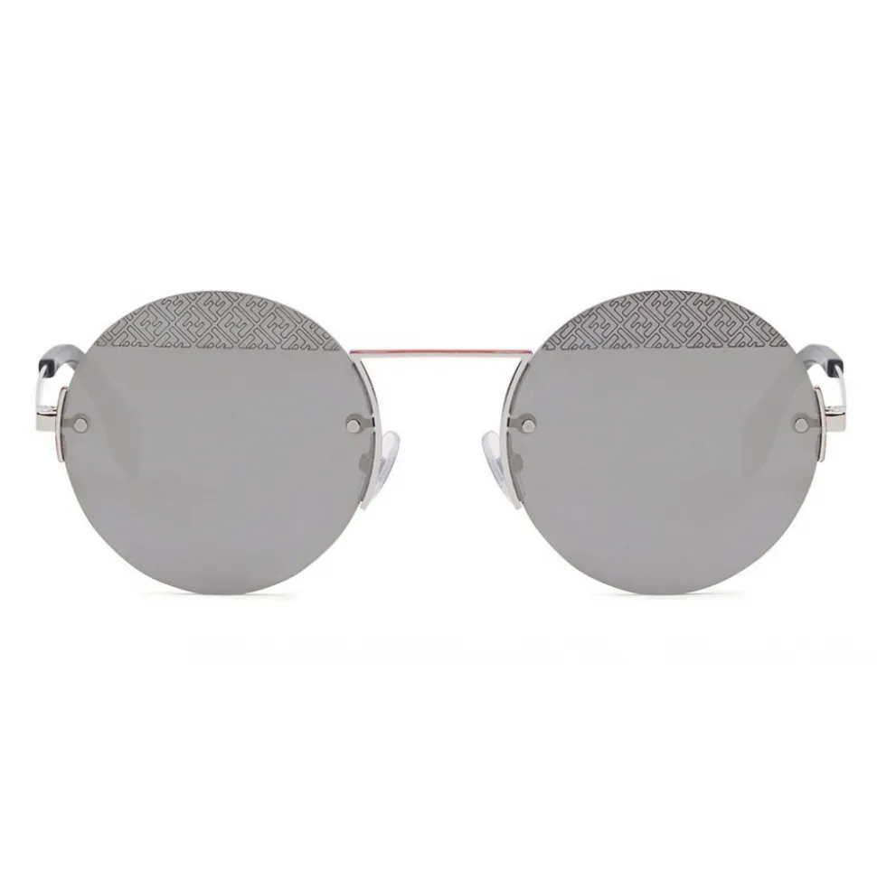 FF sunglasses characterized by a rimless construction with a minimal and ultralight round cut. The lenses are decorated with a laser engraved FF motif on the top. The design is completed by a straight bridge, adjustable nose pads and palladium finish metal temples. Silver mirrored lenses. Made in Italy.