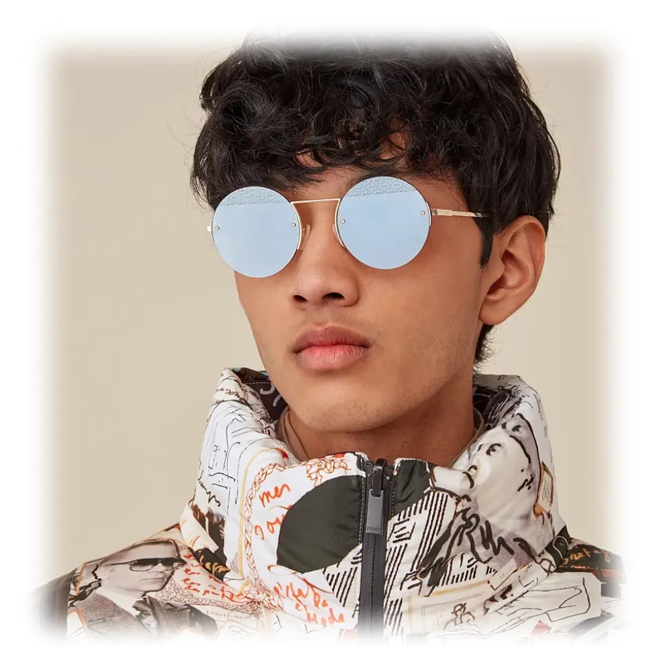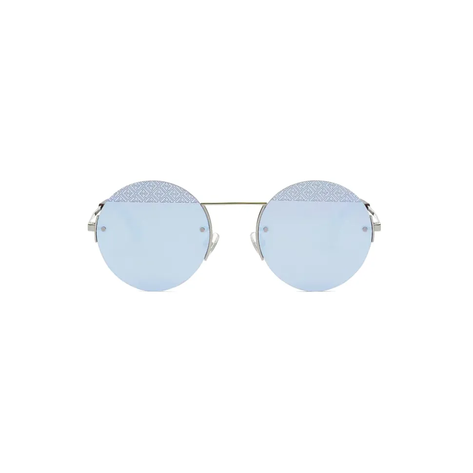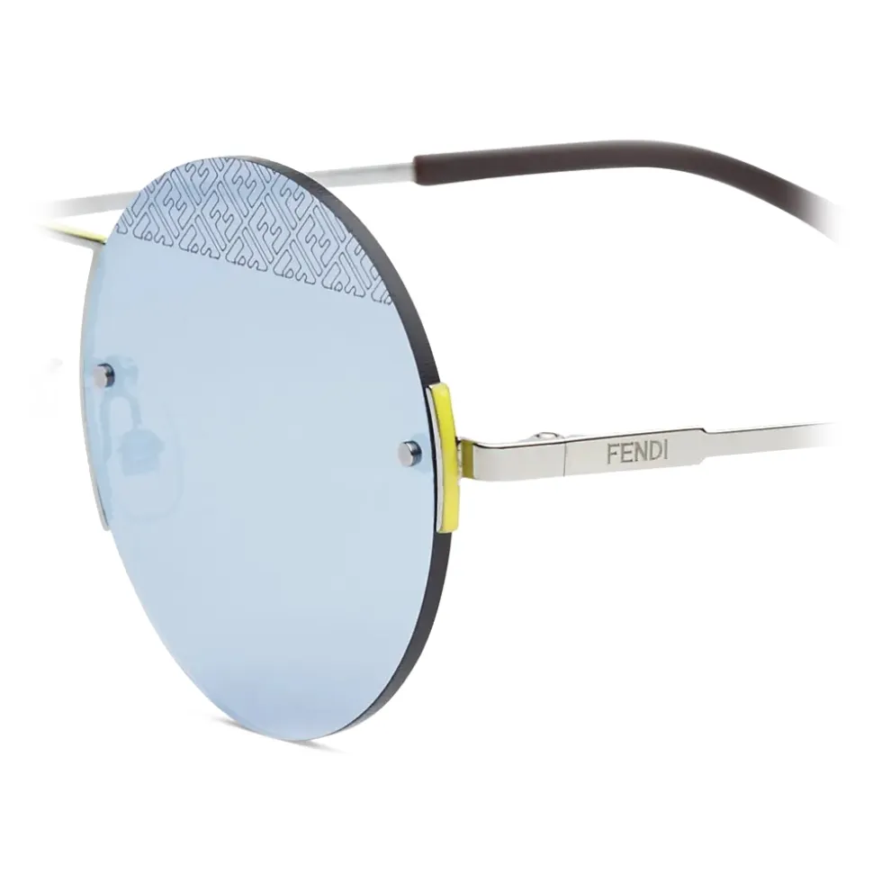 FF sunglasses characterized by a rounded shape and minimalist, ultra lightweight, rimless construction. The lenses are decorated with the FF motif laser-engraved on the upper section. The design is completed by a straight bridge, adjustable nose pads and metal temples with ruthenium finish. Light blue mirror lenses. Made in Italy.