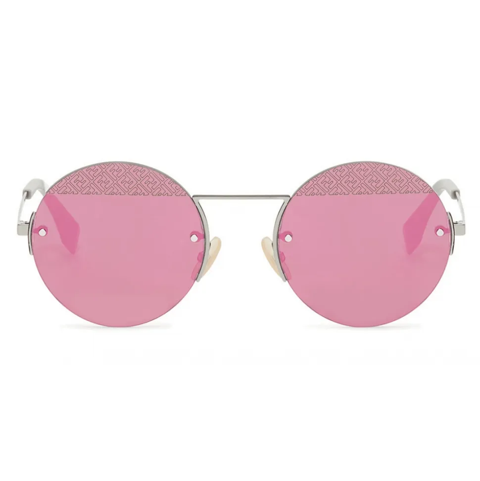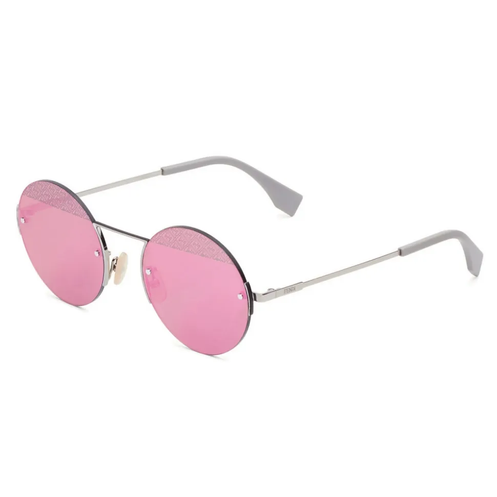 FF sunglasses characterized by a rimless construction with a minimal and ultralight round cut. The lenses are decorated with a laser engraved FF motif on the top. The design is completed by a straight bridge, adjustable nose pads and metal rods with ruthenium finish. Purple mirrored lenses. Made in Italy.