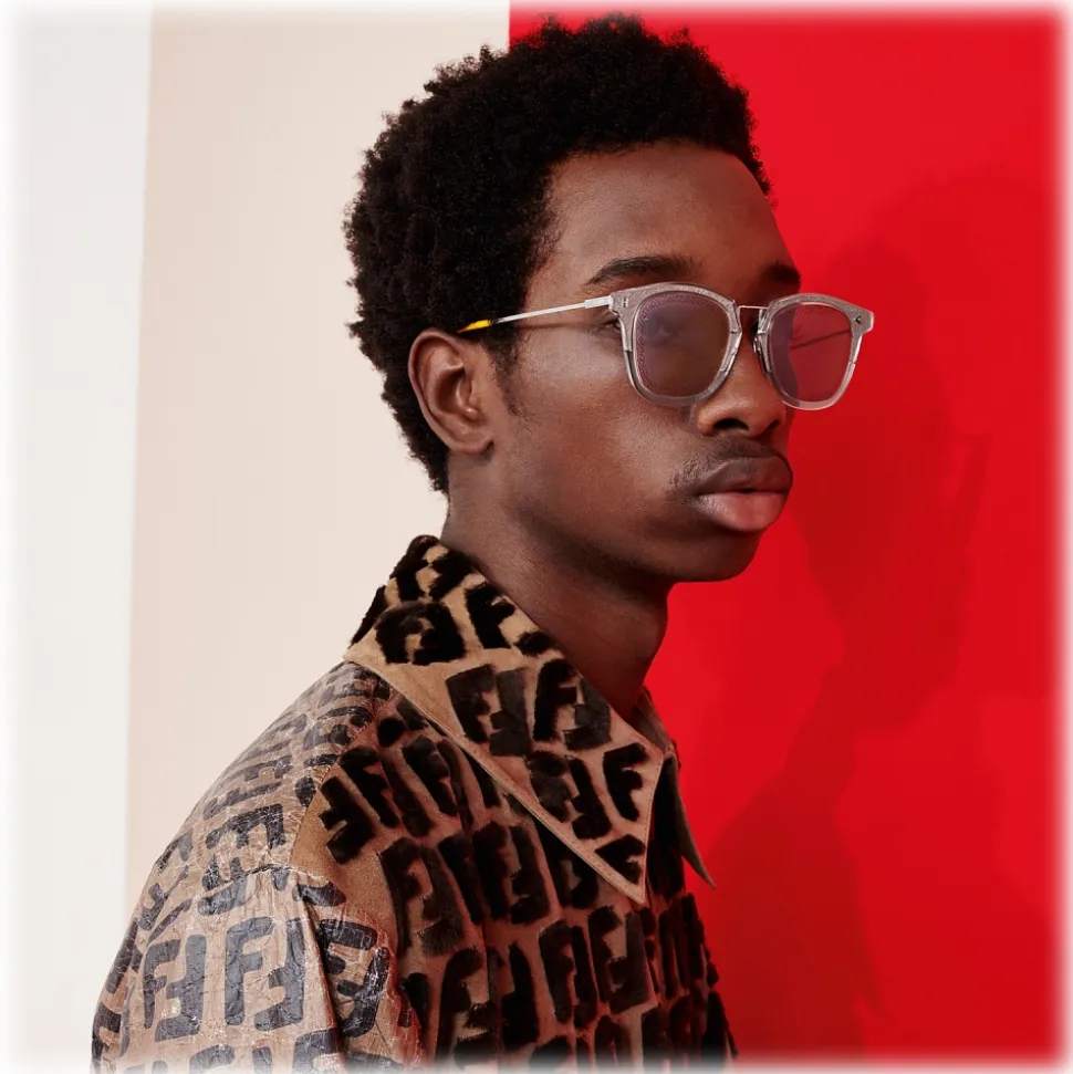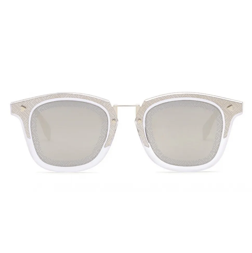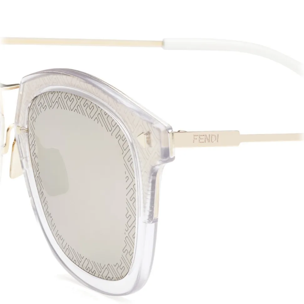 FF sunglasses with a square shape, with a transparent optyl front and gold-plated metal temples. The sophisticated and light lines of the model are personalized with the iconic FF motif, engraved on the edge of the lenses and on the metal half circle. Complete with triangular rivets, adjustable nose pads and contrasting terminals. Gray-ivory lenses. Made in Italy.