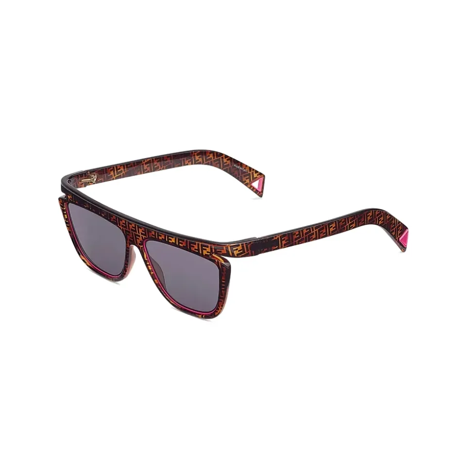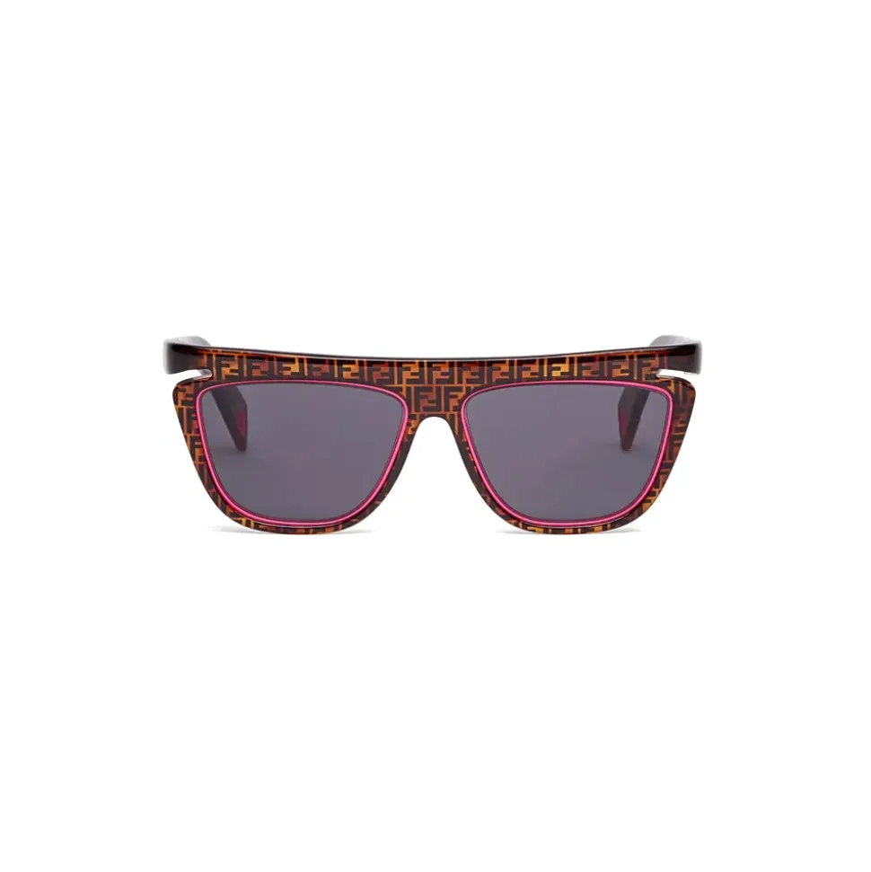 Square-shaped FFluo sunglasses made from havana optyl with FF motif. The gray lenses are circled with neon pink metal detail which is repeated with triangular design on the tips. Gray lenses. Made in Italy.