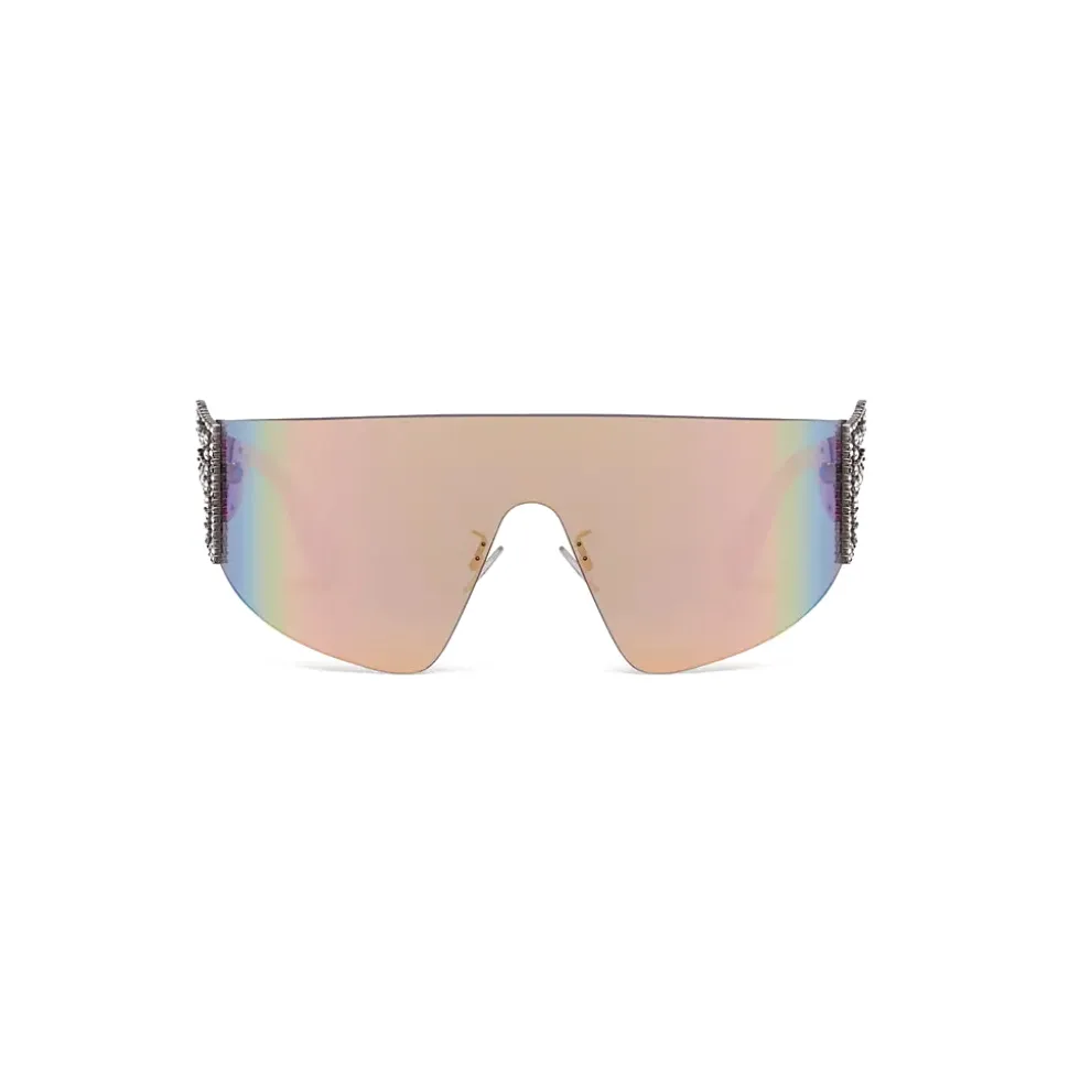 Mask-shaped, wraparound sunglasses decorated with the FFreedom logo, inspired by the decoration used in Fashion Jewelry. Single, graduated, mirror-effect, pink lens frame with pink optyl temple tips. Made in Italy.