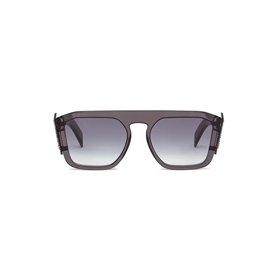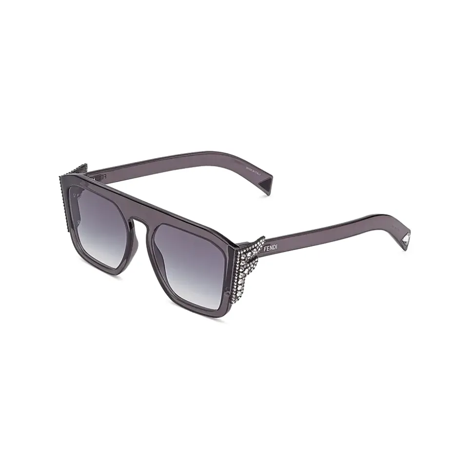 Square-shaped sunglasses decorated with FFreedom logo which recalls the decoration used in Fashion Jewelry. The transparent gray, optyl frame is completed by tips decorated with triangular Swarovski crystal. Gray gradient lenses. Made in Italy.