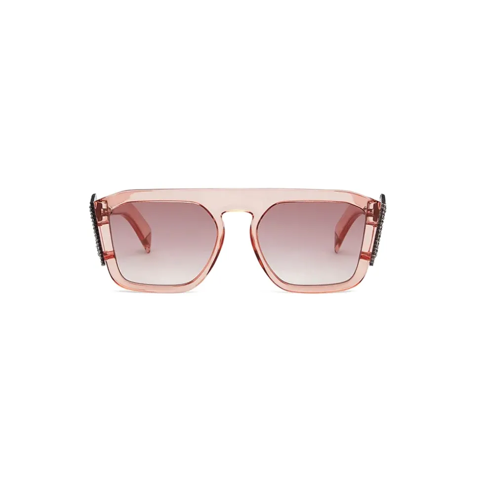 Square-shaped sunglasses decorated with FFreedom logo which recalls the decoration used in Fashion Jewelry. The transparent pink optyl frame is finished by tips decorated with triangular, Swarovski crystal. Pink gradient lenses. Made in Italy.