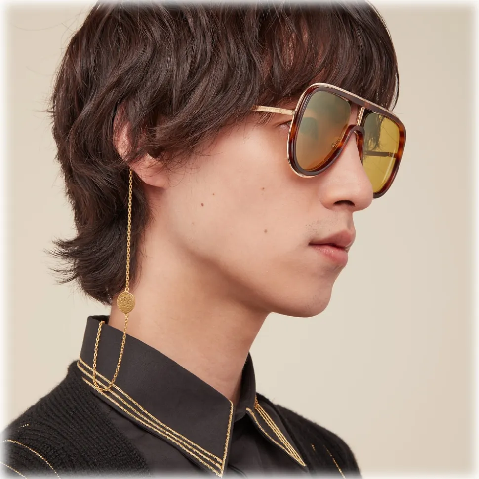 Futuristic Fendi sunglasses characterized by a refined mask construction. The front is made of injected havana and gold-finished metal. Metal cylinder on the bridge engraved with Roma / Amor lettering and metal temples with F-shaped terminal. Adjustable nose pads. Brown lenses. Made in Italy.
