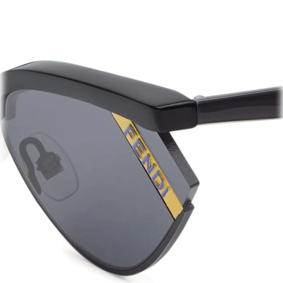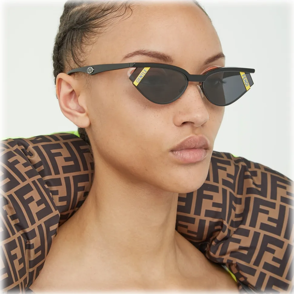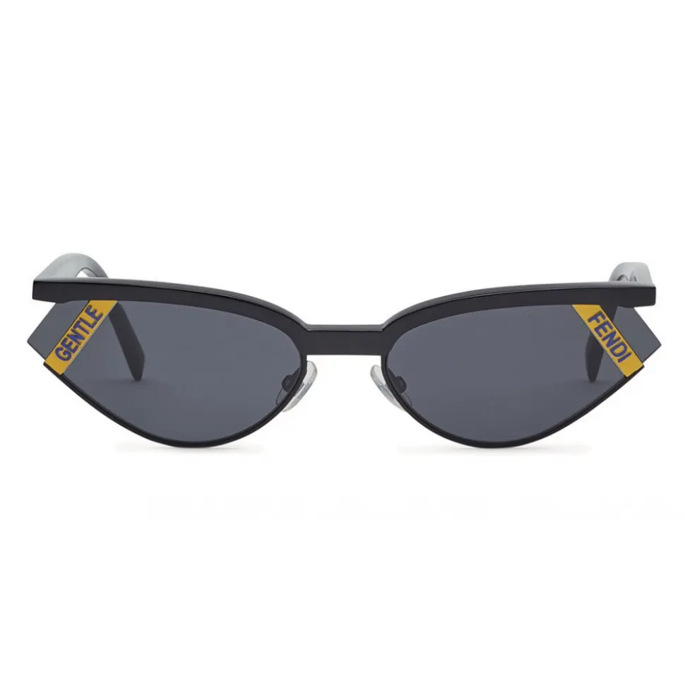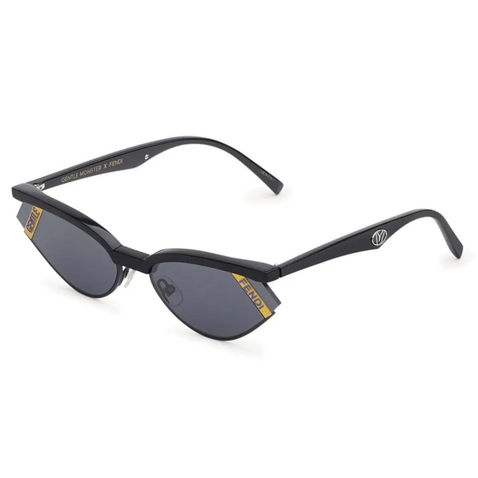 Gentle Fendi sunglasses with a small cat eye shape, created in collaboration with Gentle Monster. The geometric lines and the yellow plate with contrasting Fendi lettering on the lens define a contemporary and striking silhouette. The frame is made of a mix of materials, with an upper arch in black acetate and a lower edge in tone-on-tone metal. The auctions are personalized with the Gentle Monster logo and the signature of the laser-printed collaboration inside. Adjustable nose pads. Gray lenses with anti-reflective treatment. Made in Italy.